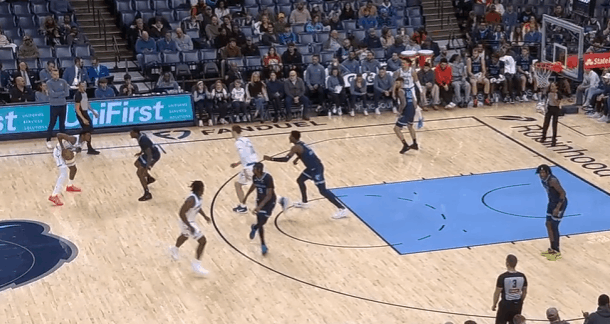 P5胯下拉回迅速衔接边路挡拆启动向中路的突破,行进间摆脱追防人后大回环合球直杀篮下,迎着JJJ起跳上篮打进。