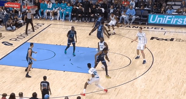 P6米勒弧顶持球借克尼普尔“Touch Screen”起手,行进间胯下变向迅速启动向中路的突破,近框起跳滞空挑篮将球稳稳托进篮筐。