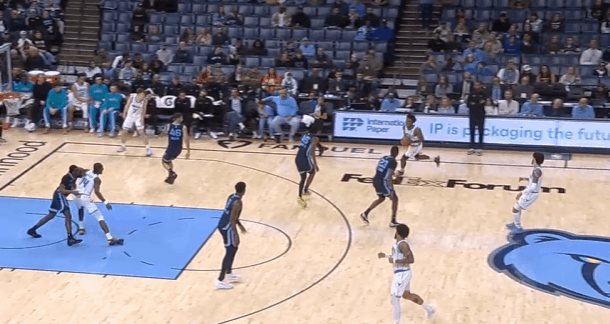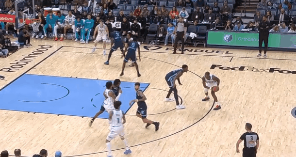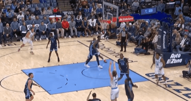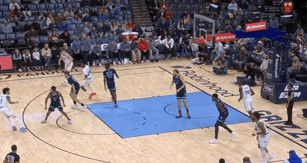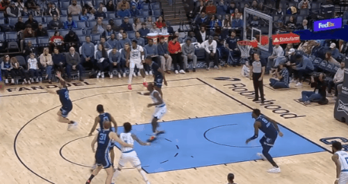 P8迪亚巴特高位拿球策应,第一波两侧同时启动的无球传切配合没出机会,随即衔接和塞克斯顿的弧顶手递手发起。塞克斯顿行进间吸引到JJJ防挡拆注意力的瞬间,迅速击地球领人找到快速下顺的迪亚巴特,迪亚巴特下顺直捣黄龙暴力终结隔扣波普。