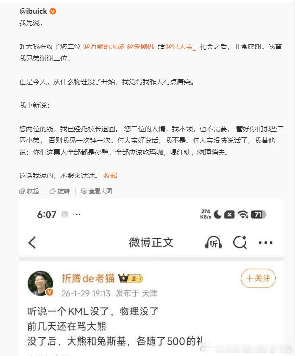 大熊和兔斯机是觉得都是同行,凑点份子是基本人情,跟立场毫无关系。老猫说话难听是老猫的事情,跟大熊和兔斯机有什么关系?哪怕一个派别内部,还有左、右、中间摇摆之分,把一个松散的群体当成单个个体来看待,本身就是极端思维、而且只会导致越来越极端。更何况,人家凑份子是凑给你的么?什么叫不领这个人情?你顶多有权力不帮忙转交不帮忙转达,你哪来的权力代人家家属说这样的话?!基本的人情世故都不懂,无语......