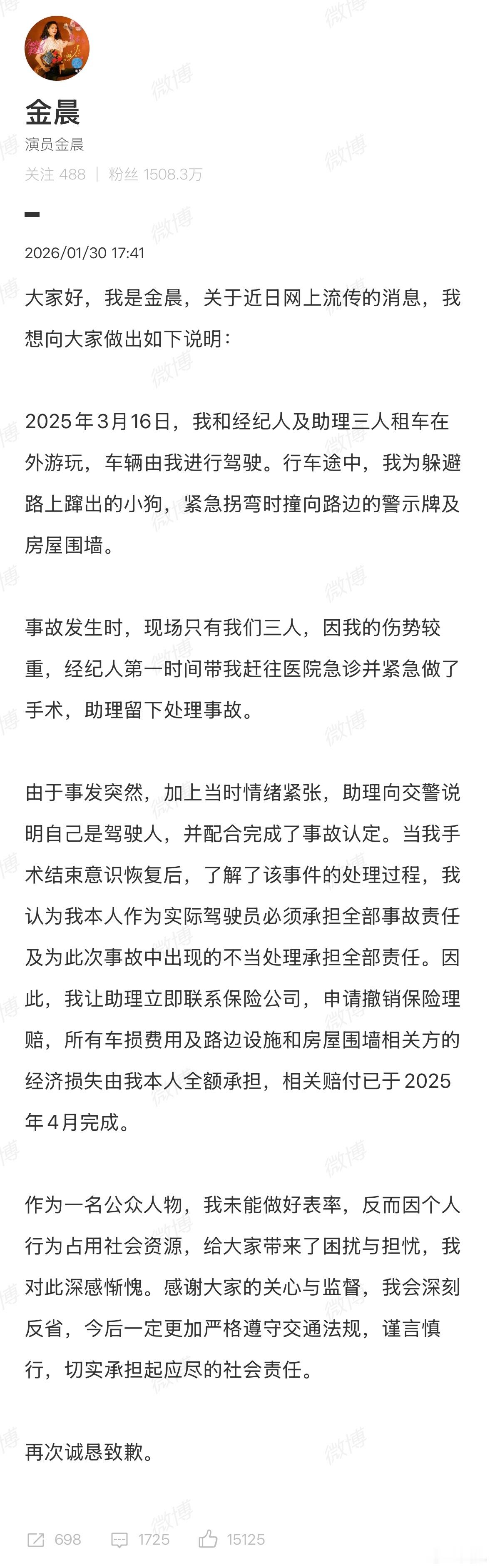 省流:金晨开的,助理谎称自己开的。警方通报金晨事件金晨脸部受伤急于就诊离开现场 金晨道歉