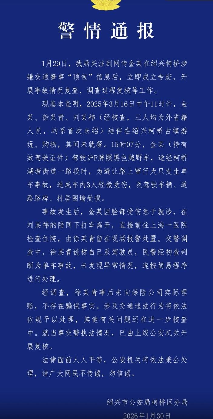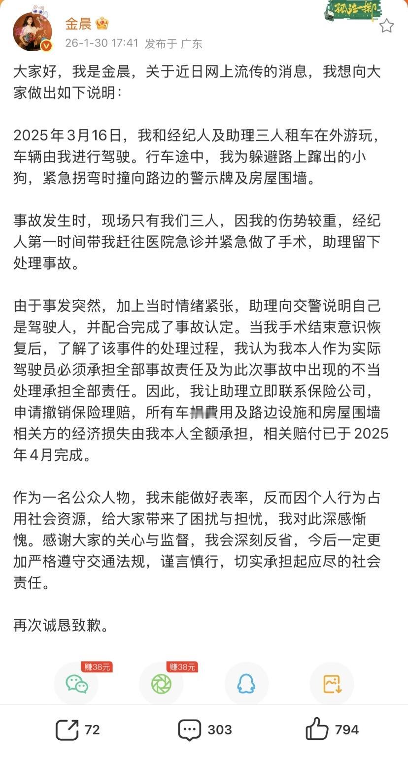金晨发文回应!承认自己是交通事故实际驾驶人 刚刚,金晨发文,详细解释此次交通事故的前因后果: 大家好,我是金晨,关于近日网上流传的消息,我想向大家做出如下说明: 2025年3月16日,我和经纪人及助理三人租车在外游玩,车辆由我进行驾驶。行车途中,我为躲避路上蹿出的小狗,紧急拐弯时撞向路边的警示牌及房屋围墙。 事故发生时,现场只有我们三人,因我的伤势较重,经纪人第一时间带我赶往医院急诊并紧急做了手术,助理留下处理事故。 由于事发突然,加上当时情绪紧张,助理向交警说明自己是驾驶人,并配合完成了事故认定。当我手术结束意识恢复后,了解了该事件的处理过程,我认为我本人作为实际驾驶员必须承担全部事故责任及为此次事故中出现的不当处理承担全部责任。 因此,我让助理立即联系保险公司,申请撤销保险理赔,所有车损费用及路边设施和房屋围墙相关方的经济损失由我本人全额承担,相关赔付已于2025年4月完成。 作为一名公众人物,我未能做好表率,反而因个人行为占用社会资源,给大家带来了困扰与担忧,我对此深感惭愧。 感谢大家的关心与监督,我会深刻反省,今后一定更加严格遵守交通法规,谨言慎行,切实承担起应尽的社会责任。 再次诚恳致歉。 金晨的声明和警方发布通告的同时发出,条理清楚,言之有物的回应了之前的“疑点”,并发出了自己受伤的照片。 但是也有网友指出:金晨回应里写的是“伤势较重”,而警方公告写的是“3人轻微受伤”。 两边说法不一致,对此回应你怎么看?金晨