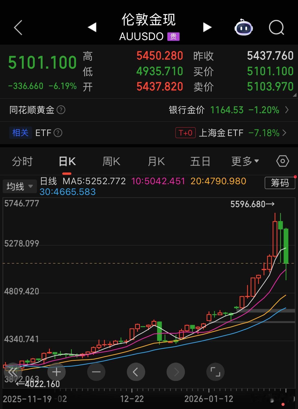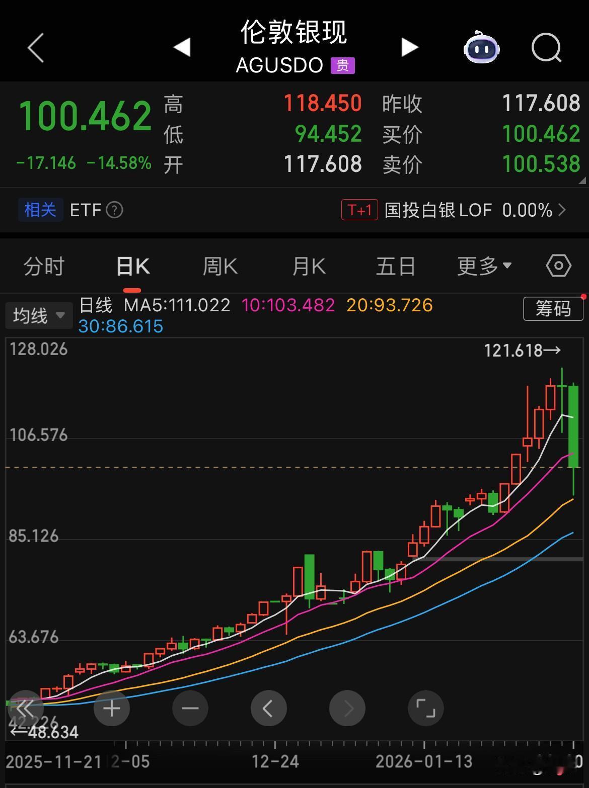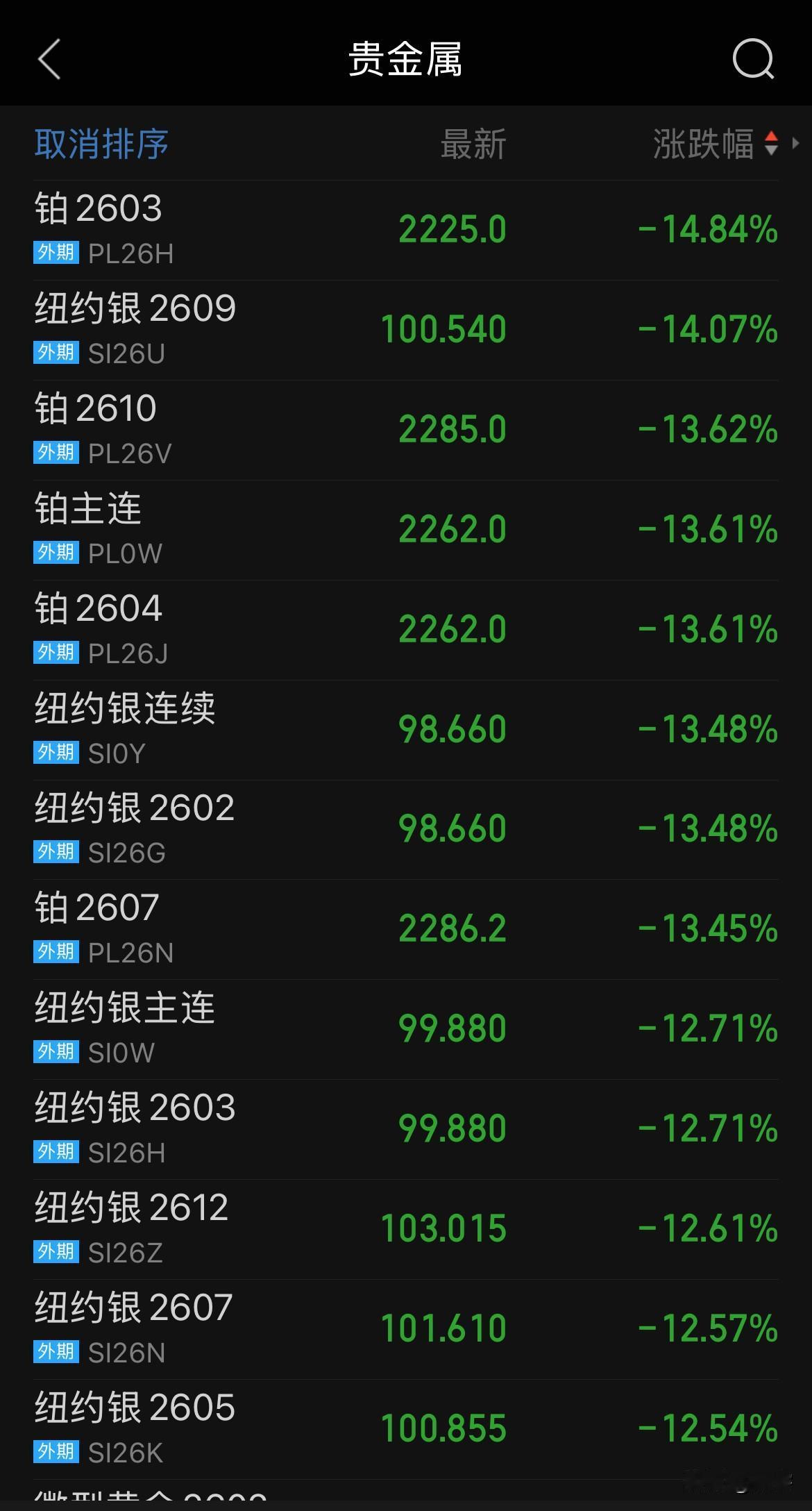 贵金属风暴不停歇,黄金白银持续大跌。 黄金现货连续大跌超过6%,当日最高跌幅超9.23%,跌破5000美元关口; 白银现货跌幅超过14%,当日最高跌幅19.68%,跌破100美元关口; 铂金、纽约银等现货跌幅均超12-14%。 疯涨之后的狂跌,论谁承受得住连续每日以10-20%幅度的调整?