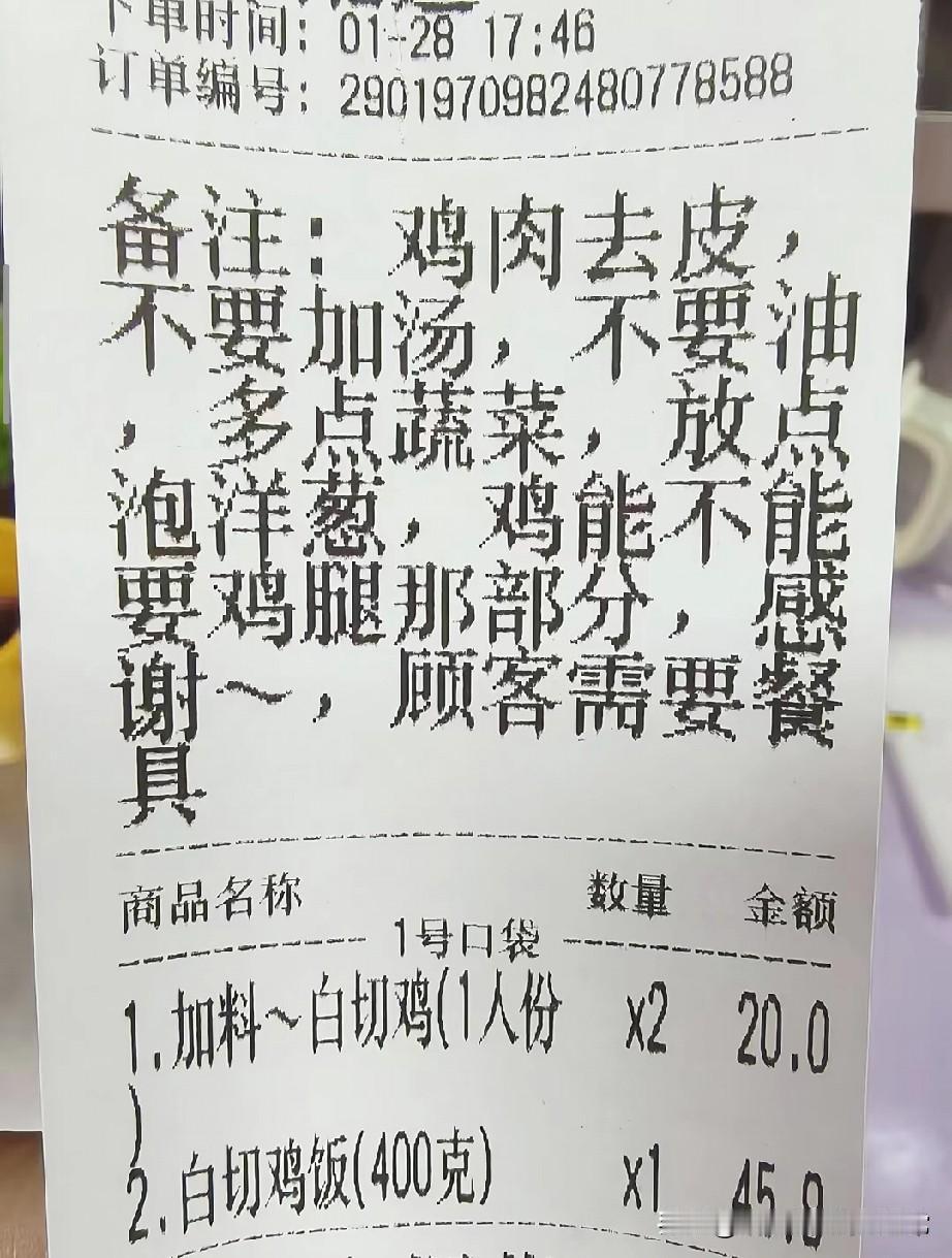 开快餐店的老表哭了: 20块钱的外卖,顾客提了8条要求! 开快餐店的老表今天跟我吐槽,说遇到了个“祖宗级”顾客,一份20块钱的白切鸡,备注写得比他一天的营业额还长:鸡肉去皮、不要加汤、不要油、多放蔬菜、加泡洋葱、指定要鸡腿肉,最后还要餐具。 老表看完直接懵了:“我这是快餐店,不是米其林私厨啊!”忙活半天赚不到5块钱,还要被当服务员使唤。 现在的顾客真的把“上帝”身份焊在身上了?点个外卖既要薅羊毛,又要当甲方爸爸。商家赚的是辛苦钱,不是伺候人的钱。 换作是你,会为了这20块钱,满足这些离谱要求吗?