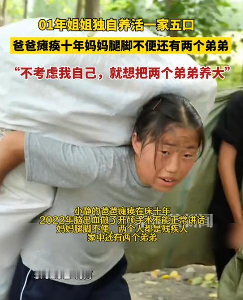 朱门酒肉臭,路有冻死骨!2024年,河南00后女孩独自养活一家5口!父亲瘫痪在床10年、母亲腿脚残疾,她靠捡垃圾养活两个弟弟,面对镜头她苦笑着说:“我的人生就这样了吧,我情愿牺牲我自己......” 2024年凌晨四点的河南街头,天还黑得透透的,大多数人还沉在梦乡,一个瘦小的身影已经背着蛇皮袋穿梭在街巷里。她是小静,一个01年出生的姑娘,本该穿漂亮裙子、享受青春的年纪,却成了一家五口的顶梁柱,靠捡垃圾、打零工撑起了摇摇欲坠的家。 没人能想到,这具看似柔弱的身躯里,藏着怎样坚韧的力量,小静的人生从父亲意外瘫痪那天起,就偏离了原本的轨道,父亲这一瘫就是十年,家里的顶梁柱轰然倒塌,只剩腿脚不便的母亲打零工勉强糊口,好在有爷爷帮衬,日子虽紧巴却还能维系。 可命运偏要对这个苦命的家庭赶尽杀绝,2022年父亲突发脑溢血,开颅手术花光了所有积蓄,借来的钱也只是杯水车薪,术后的父亲连话都不能说,照料难度更是翻倍。 屋漏偏逢连夜雨,爷爷的病逝让这个家彻底失去了最后一根稻草,母亲行动不便无法外出务工,两个弟弟一个15岁、一个13岁,还在上学的年纪,所有重担一股脑压到了21岁的小静身上。 小静不能像同龄人一样外出打工,因为瘫痪的父亲离不开人照料,只能守在家附近,把捡垃圾当成了主业。 起初捡垃圾时小静也觉得丢人,可当她想到父亲的药费、弟弟的学费,便放下了所有体面,每天天不亮就出门,垃圾桶就是她的工作台,塑料瓶、纸板、易拉罐,只要能换钱的都一一收好。 有时候遇到工地散活小静也跟着去干,明明力气不如男人们大,却咬牙坚持,就为了多挣几十块钱,攒满一大袋废品后,她得用瘦弱的肩膀扛着,步行送到回收站,袋子比她人还大,几乎要把她整个人淹没。 白天在外奔波,晚上回家也得不到片刻清闲,给父亲翻身、擦洗、喂饭,帮母亲收拾家务,给弟弟们准备三餐,还要和母亲一起做手工活补贴家用,那些手工活每个只赚6厘钱,一天忙下来也只能挣十几块。 有一次小静在垃圾堆里翻找时被玻璃划伤了手,鲜血直流,也只是简单包扎一下就继续干活,因为那天捡的废纸卖了四十多块,够买一周的大米。 面对镜头时,小静满是污渍的脸上挂着苦笑说道:我的人生就这样了吧,我情愿牺牲我自己,其实她也羡慕过同龄人,羡慕那些能穿漂亮裙子、有父母疼爱、可以追逐梦想的日子,那些在别人眼里稀松平常的生活,对她来说都是遥不可及的奢望。 小静不是没想过放弃,可看着病床上的父亲、愧疚的母亲,还有懂事的弟弟,就只能咬着牙硬扛。 好在苦难没有一直笼罩这个家庭,善意的微光终究照了进来,小静的事迹被报道后,引发了无数网友的心疼与关注,附近的居民会主动给她留可回收废品,有大妈常给她准备热乎饭。 爱心网友们纷纷伸出援手,有人要给她送三轮车,有人提供工作机会,还有人直接转账资助,当地相关部门也及时介入,承诺资助两个弟弟直到18岁,还给予了家庭相应的补助。 最让人动容的是弟弟的话,他说希望姐姐早点嫁人,早点离开这个家,这句看似赶人的话,藏着对姐姐最深的心疼,而小静的抖音账号里,全是一家人的日常,她会记录给父亲喂饭的瞬间,会分享和弟弟们做家务的片段,满墙的奖状,是弟弟们给她最好的回报。 有人说苦难不值得歌颂,但在苦难中不屈不挠的灵魂值得,小静用21岁的肩膀,扛起了不属于这个年纪的重担,她的苦笑里藏着无奈,却更藏着对家人的责任与爱,那些凌晨街头的奔波,那些日复一日的操劳,都在诉说着一个普通女孩的坚韧。 如今的小静依然在为这个家奔波,但身边多了无数人的陪伴与帮助,她的人生从不是就这样了,那些善意与坚持,终将为她铺就一条更宽的路。 愿这个懂事的姑娘,既能护住家人的安稳,也能遇见属于自己的幸福,愿所有在苦难中坚守的人,都能被世界温柔以待。 麻烦看官老爷们右上角点击一下“关注”,既方便您进行讨论和分享,又能给您带来不一样的参与感,感谢您的支持! (参考信源:河南广播电视台乡村观察2024-05-22——《加油姑娘!你的人生不止于此!)