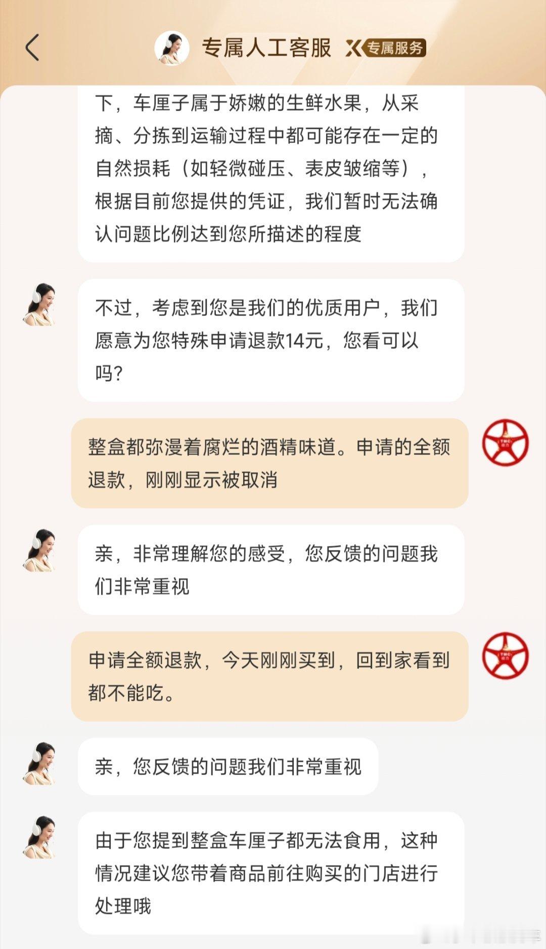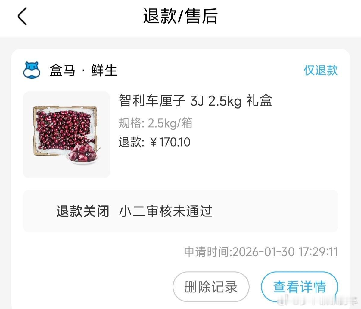 因为一盒严重腐烂的车厘子,盒马失去了我这个会员客户。在盒马买东西,我就讲究一个放心,随手就可以拿走,不用担心商品的质量,但今天买到的这一盒打折的车厘子,我原以为只是没那么新鲜,没想到开箱后腐烂味道满盒。线上申请全额退款没成功,人工客服说只能退14元,全额退款要求到店,于是我跑多一趟,到服务中心成功退款全额170元。虽然我的盒马会员10月才到期,但我应该不会再来盒马买东西了。盒马失去了一个会员 广州