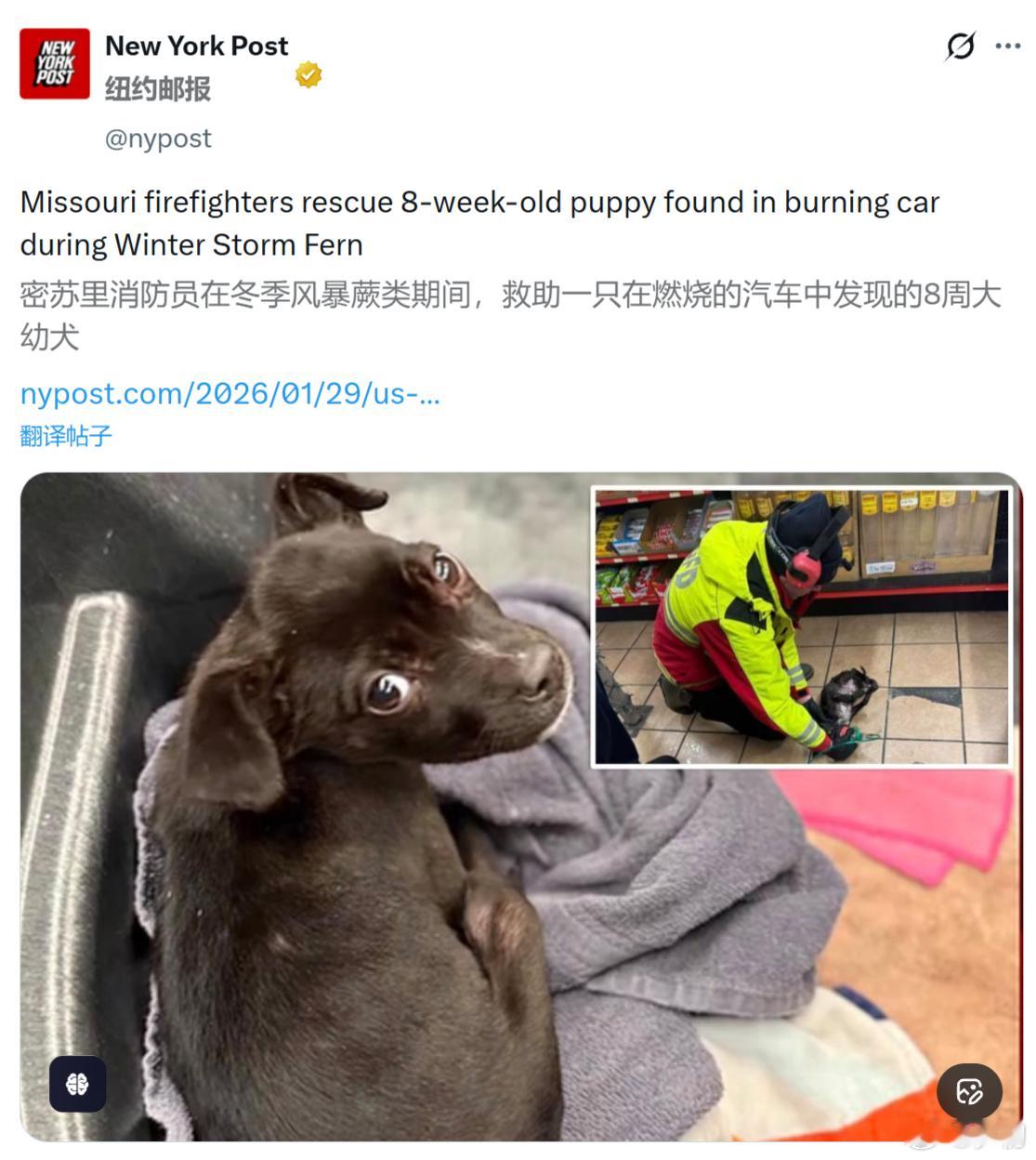 《纽约邮报》:美国密苏里消防员在冬季风暴期间,救助一只在燃烧的汽车中发现的8周大幼犬。虽然冻死了那么多美国人,但是我们救了一条狗啊!美国冬季风暴已致85死 美国暴雪划出物理斩杀线