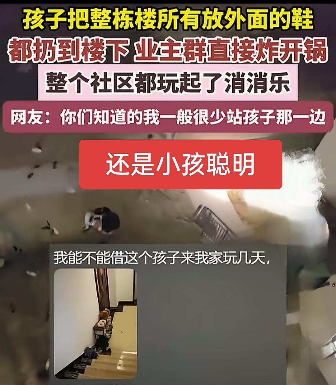 还是小孩聪明!前几天刷了一个视频,邻居将鞋柜放门口,楼道里臭气熏天,搞得邻居间矛盾不可调和,找物业啥的都没很好的解决! 万万没想到小孩哥出手解决了这一难题,小孩哥一顿输出,把鞋全扔下了楼,搞得满地飘鞋,小孩顽皮也不能把他咋滴,然后就没有然后了! 评论区全是向小孩哥求助的![笑哭][笑哭] 邻居乱放鞋子 室内楼道鞋柜