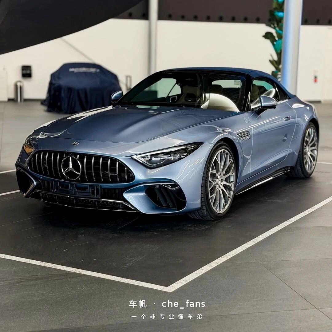 这车还挺好看的! 地中海浅蓝金属车漆,搭配午夜蓝软顶敞篷,我想这就是专属于AMG的浪漫调色盘吧。 经典的Panamericana竖瀑格栅遇上修长的敞篷车身,运动与优雅的平衡被拿捏得恰到好处。 四出排气+AMG专属轮毂,静态下都能感受到V8引擎的躁动。 这才是敞篷GT该有的样子啊!