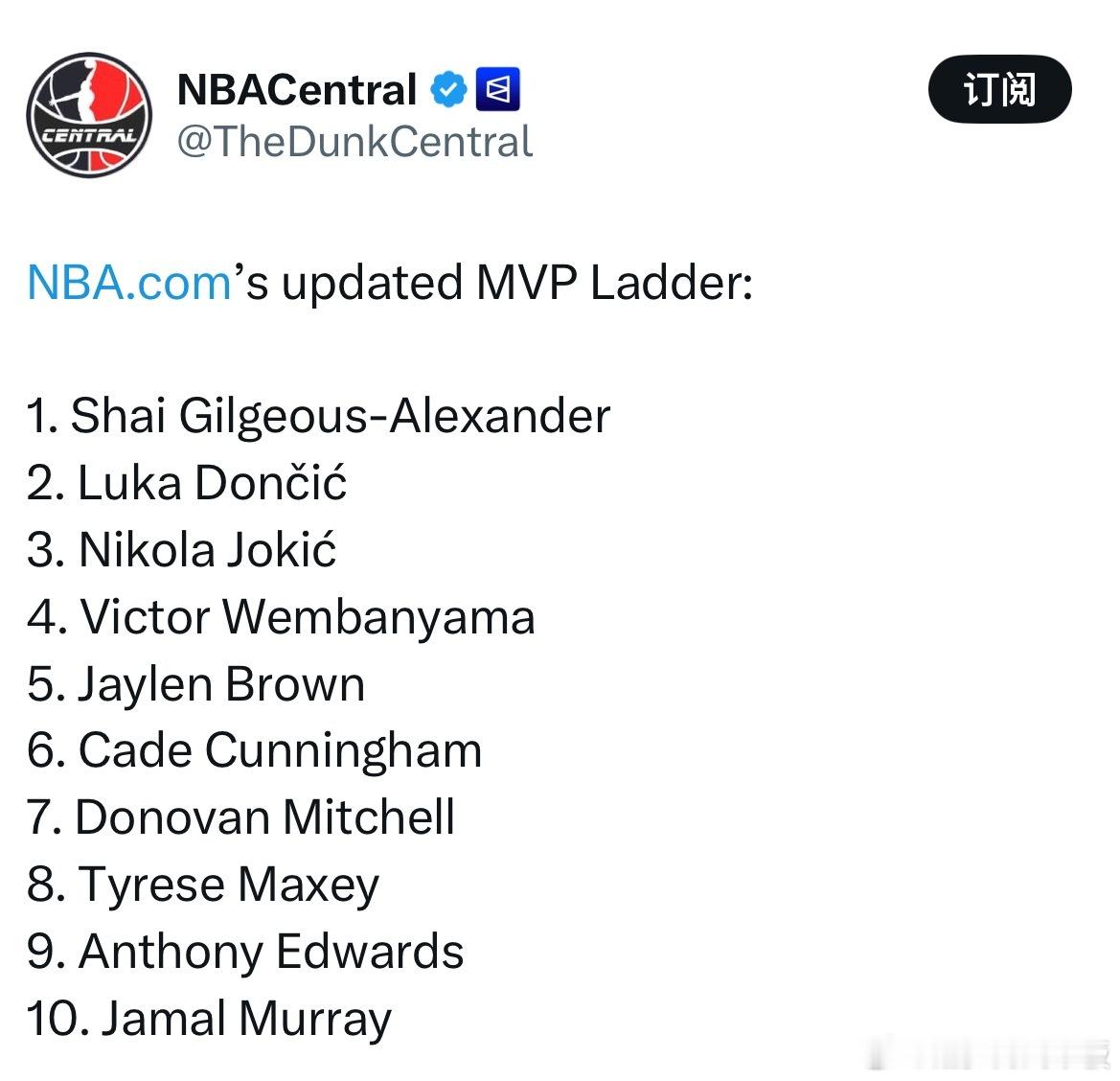 NBA官网最新MVP榜单,东契奇反超约基奇升至第2名👀