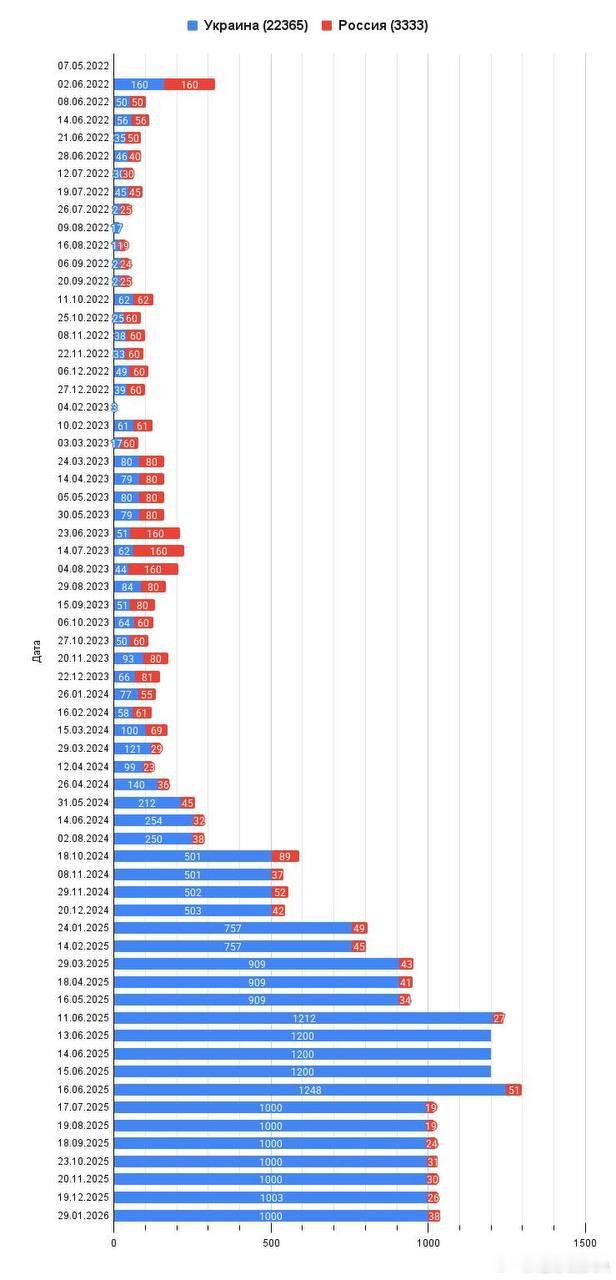 俄乌冲突 一年时间,36.28:1这就是俄乌战场优势的代表性体现。昨天,俄乌双方完成了今年首次阵亡士兵遗体交换。乌克兰收到了1000具遗体,俄罗斯收到了38具。从2022年至今,双方整个阵亡军人遗体交换期间,俄方总共向乌克兰移交了22365具遗体,乌方向俄罗斯移交了3333具。乌俄阵亡军人遗体数量比例为6.71:1,但是,自2025年初以来,这一比例为36.28:1泽连斯基拒绝赴莫斯科会谈