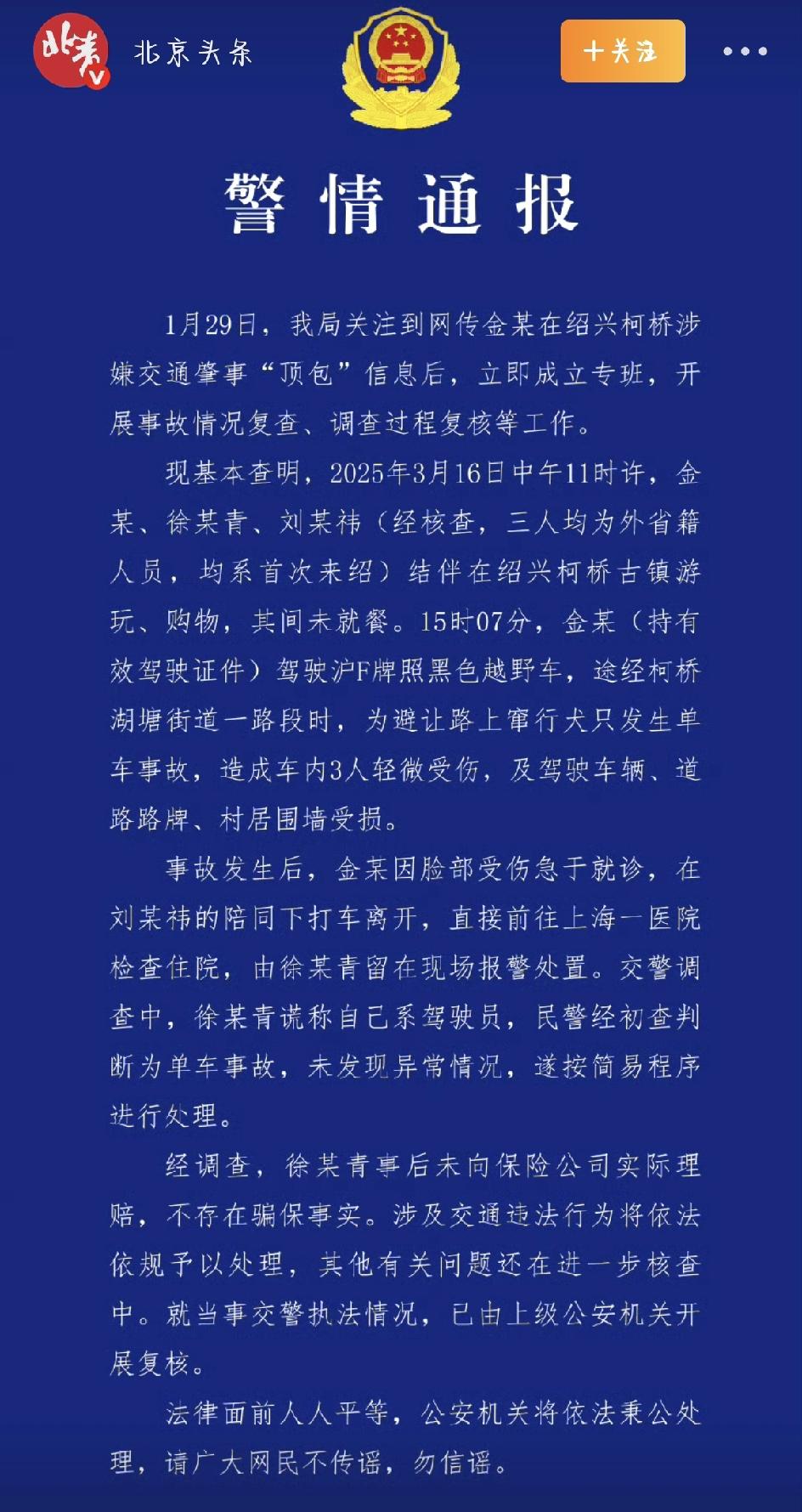 这两天,演员金晨的名字可是在热搜上挂了好一阵,原因是有传闻说她和一场交通事故有关,还牵扯出“顶包”、骗保之类的说法,一时间大家都议论纷纷。直到1月30日,浙江绍兴市公安局柯桥区分局发布了正式的通报,把事情经过说清楚了,金晨自己也随后发声道歉。 整件事还要追溯到去年——2025年3月16日。那天中午11点多,金晨和经纪人徐某青、助理刘某祎一起在绍兴柯桥古镇逛街购物,几个人一直没吃午饭。下午3点07分左右,金晨开着一辆沪F牌照的黑色越野车,在经过柯桥湖塘街道一段路时,突然有只狗从路边窜出来。为了躲开它,金晨急忙打方向,结果车撞上了路边的指示牌和居民围墙,成了一桩单车事故。这一撞挺严重的,车头坏了,路牌和围墙也受损,车上三个人也都受了点轻伤。 事故发生后,金晨因为脸上伤得比较明显,着急去治疗,就在助理陪同下打车直奔上海一家医院检查,并住了院。而经纪人徐某青则留在现场处理后续、报警。可没想到,交警到场询问时,徐某青却谎称自己才是当时的司机。民警初步勘查后,觉得这是一起普通的单车事故,没发现其他问题,就按简易程序处理了。 事情本来已经过去快一年,谁知2026年1月29日,突然有人爆料称金晨涉嫌肇事逃逸、“顶包”,甚至怀疑她骗保,一下子又把这件事推上了风口浪尖。绍兴柯桥警方注意到网络上的讨论后,马上成立专班重新核查事故情况,也对当时的调查过程进行了复核。 经过仔细调查,警方确认徐某青事后并没有向保险公司申请理赔,不存在骗保这回事。不过,徐某青冒充驾驶员的行为已经涉嫌交通违法,接下来会依法处理。另外,对于当时出警交警的执法情况,上级公安机关也已经开始复核,其他问题还在进一步调查中。 通报出来后,金晨很快在微博发文道歉,还配了一张去年事故后脸上带伤的照片。她表示自己作为实际驾驶员,愿意承担全部责任,事故造成的所有损失——包括车损、路牌和围墙的维修费用,已经在2025年4月全部赔完了。她也解释,当时因为受伤不轻、情绪紧张,助理才做出了顶替的举动,她自己手术清醒后就立刻让助理撤销了保险理赔申请。 有律师也出来分析,说金晨因就医离开现场,不构成肇事逃逸。警方通报里也提到她当时没吃饭、持有效驾照,说明不存在酒驾或无证驾驶的情况。不过助理徐某青虚假陈述的行为,已经违反《治安管理处罚法》,可能会被处以拘留或罚款。 目前事情还在进一步处理中,警方也提醒大家不传谣、不信谣。作为公众人物,金晨这次的处理方式确实不太妥当,无论原因如何,都占用了公共资源,也给很多人带来了困扰。希望接下来有关部门能依法公正处理,也给公众一个清楚的交代。 来源:北京头条