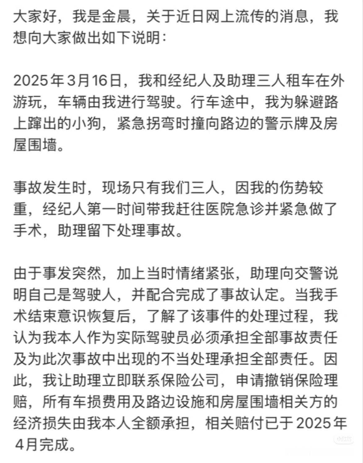金晨道歉金晨公布车祸受伤照片金晨发文道歉,承认驾车发生交通事故后因受伤紧急就医,助理处理事故时错误承担驾驶人责任,而她术后主动纠正并承担了全部赔偿 ,不信谣,不传谣