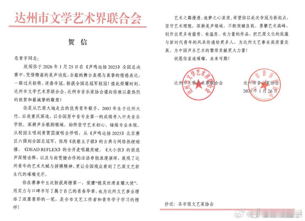 达州文联给危晋宇夺冠发祝贺信达州娃危晋宇火遍全国!文联贺信送上,这份认可太有分量了声鸣远扬