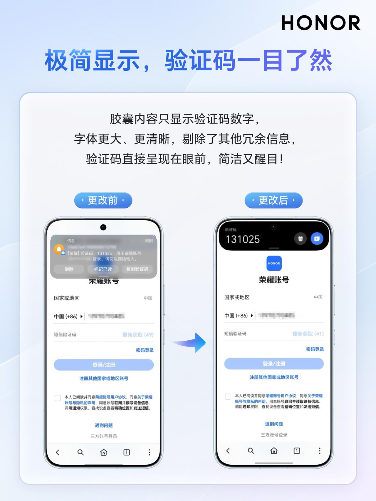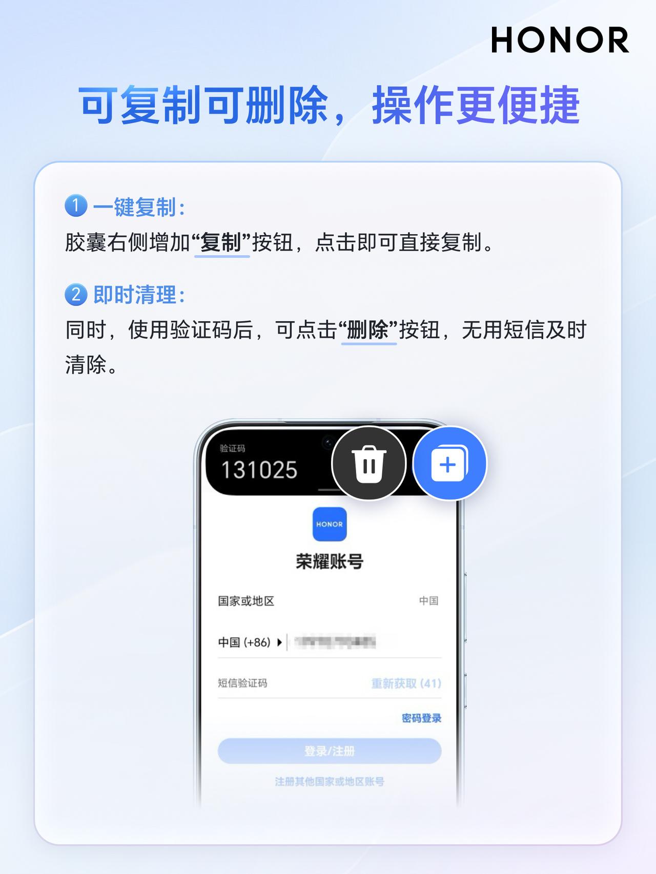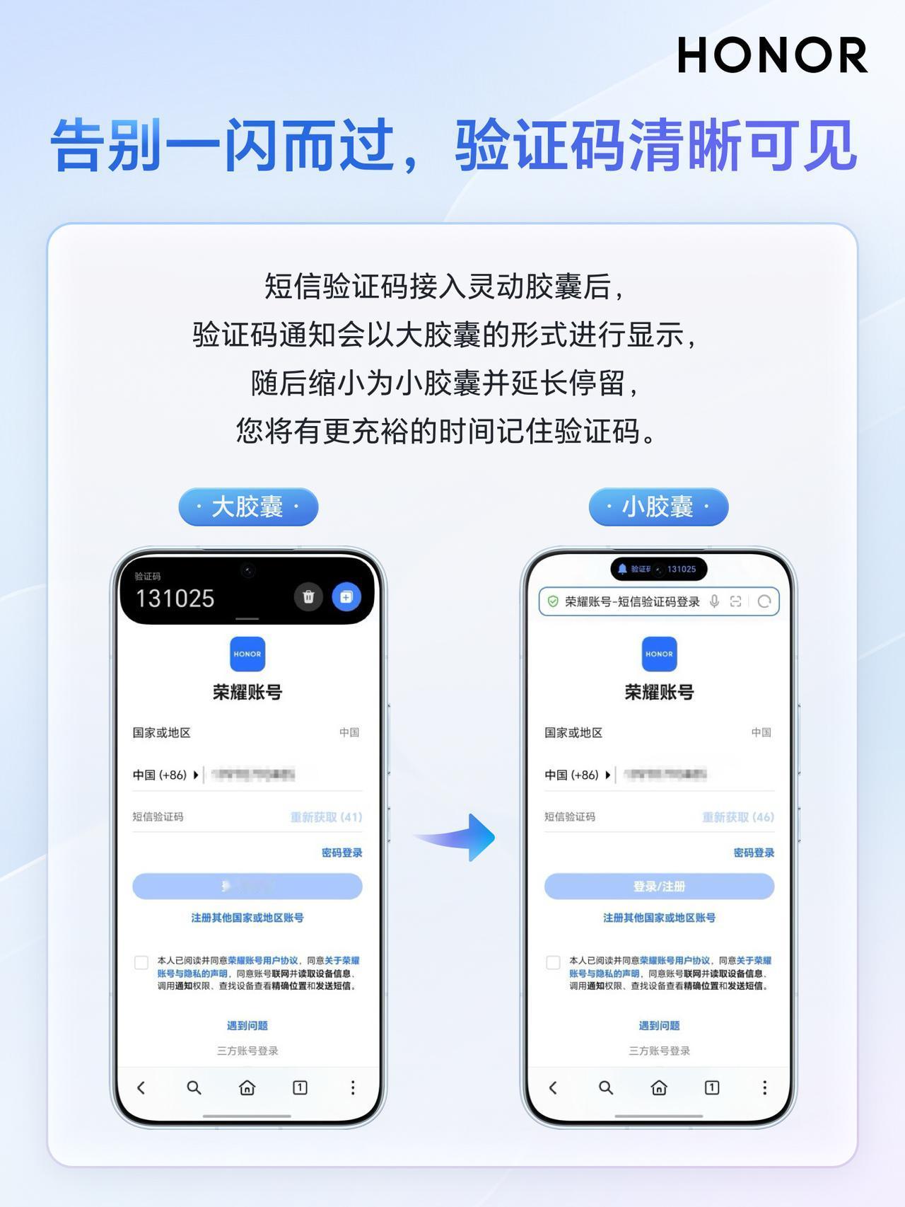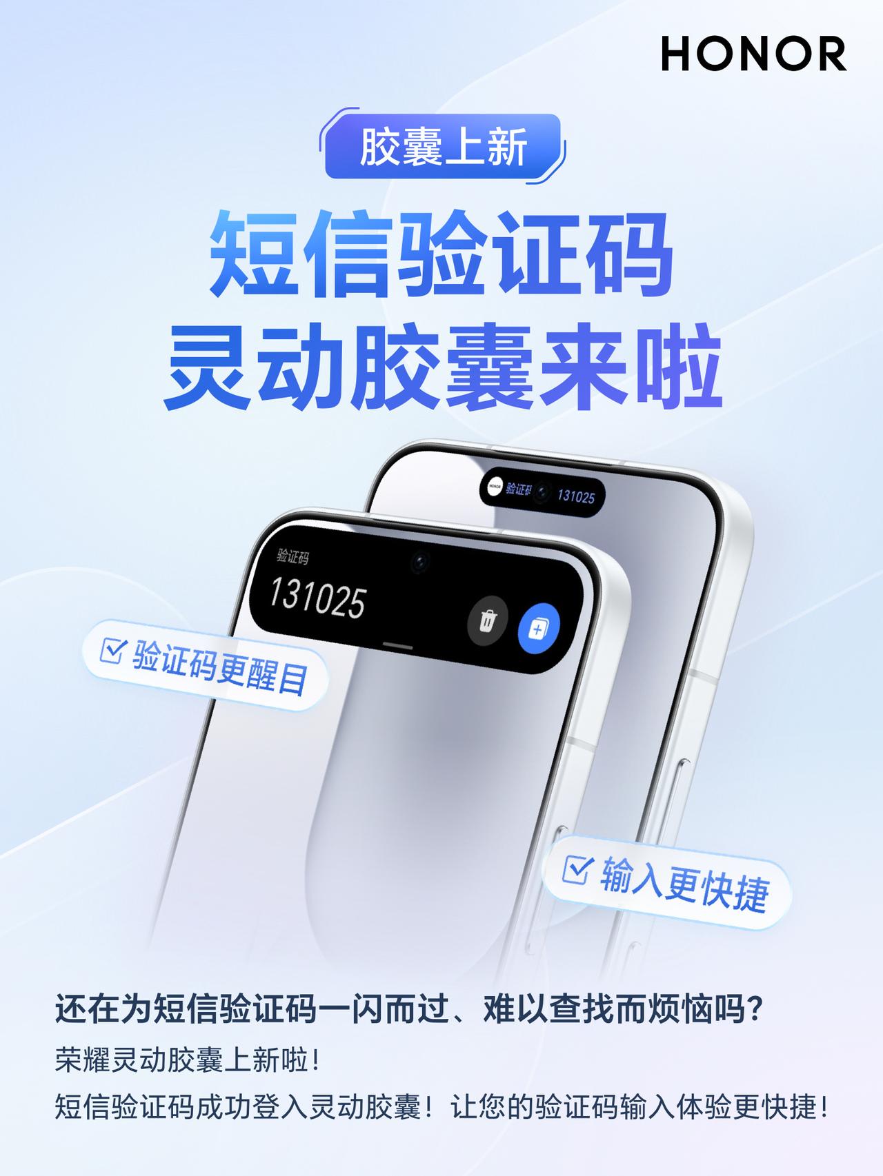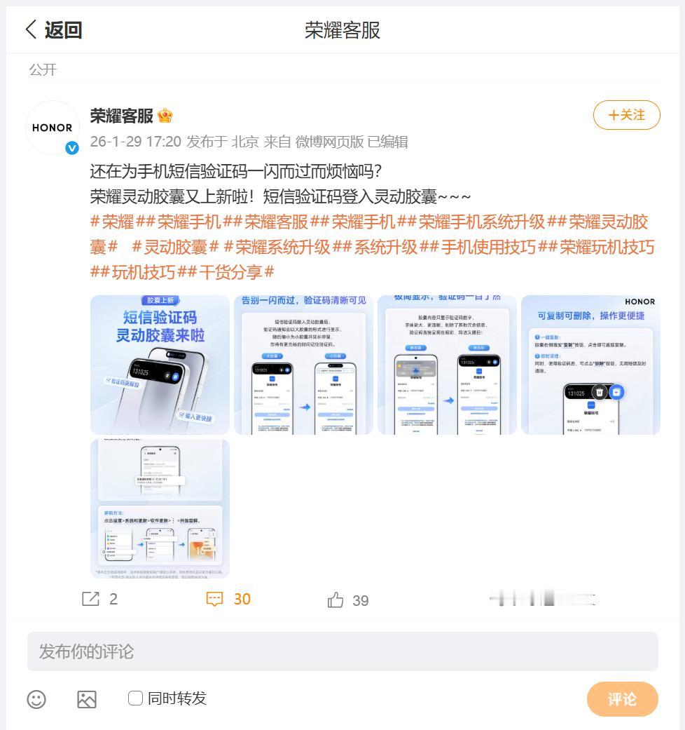 荣耀手机MagicOS 10小伙伴们有没有关注过呢?刚刚看到荣耀客服通过一组图文,为大家介绍了胶囊上新:短信验证码灵动胶囊来了。能够避免因为短信验证码一闪而过,难以查找而带来的烦恼,尤其对于家中长辈来说,确实比较贴心,使用起来相当方便。 短信验证码接入荣耀手机MagicOS 10灵动胶囊之后,验证码通知会以大胶囊进行演示,随后缩小为小胶囊并延长时间停留,这种情况下大家在输入验证码的时候,可以对照输入,当然可以实现一键复制的功能,当然也可以操作删除按钮进行相关的操作,便捷许多。 大家在使用前要将荣耀手机MagicOS 10升级到最新版本、短信APP升级到最新版本。现在只需关注 @超逸谈科技 并转发此微头条,2026年02月01日,将由 选出1位粉丝包邮送出暖暖杯55度礼品装,说不定下一个中奖的就是你哟!抽奖详情
