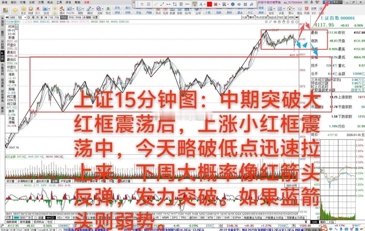 大A:下周强弱分水岭 1月30日 大A下跌0.96%,中期上涨趋势4080-4190点震荡。今天开盘急下探创4064点新低,随后迅速拉起来。下周见强弱,下周一小下探迅速拉升过了4138点,之后调整不破4117点,则要冲击4190点概率大。主观预期应该是上冲概率大。但如果下周一下探逼近4064点,反拉过不了4138点,相对弱势,接下来有朝4064点收窄震荡,大概率还会去4034点。 创业板上涨1.27%,中期上涨震荡上沿3257-3416点小震荡。今天略创出3255小新低,迅速拉上来,刚好碰到3367小高点,继续震荡。下周一应该再上冲,冲击3416点,向上变盘。如果下周大幅下探,容易反拉上不去,相对弱势,朝3255点收窄小震荡可能。 科创50上涨0.12%,中期上涨趋势宽幅震荡上沿收窄1460-1575点震荡。今天探底回升,低点正好逼近1460点止跌反弹,下周一小下探后强势反弹,站上1522点,大概率要向上突破1588点。下周一如果上不去,则会下探逼近1460点,反拉过不了1507点,随后朝1460点收窄小震荡,相对弱势。 沪深300下跌1.0%,中期上涨趋势宽幅震荡上沿收窄小震荡,今天瞬间破出新低,迅速拉上来,下周能迅速站上4734点,则向上突破概率大。如果再下探逼近4645点,相对弱势,再创新低概率大。 今天领涨的题材概念:转基因、种植业与林业、大豆、造纸、玉米、光纤概念、F5G概念、共封装光学、粮食概念、影视院线、通信设备、环保设备、橡胶制品、环氧丙烷、农业种植、自动化设备、铜缆高速连接、丙烯酸、烟草、养殖业、生态农业、科创次新股、旅游及酒店、网约车、电子化学品等。今天再次板块轮动,农业、算力、机器人、AI应用等领涨。今天市场探底回升,一些高位板块调整幅度较大,随后迅速拉上来,下周能带领上证指数上冲的板块,大概率是领涨的板块。从近期强势领涨频率来看,还是算力、金属、商业航天、保险、电网设备等继续强势概率大。商业航天今天探底回升,略破前面小低点,迅速拉上来,下周再上冲,很大概率走第二波上冲。金属方向今天调整幅度大,下周小下探后也有强势反弹的可能。