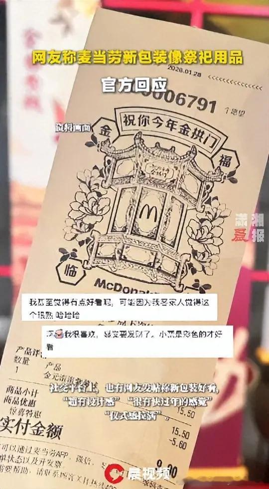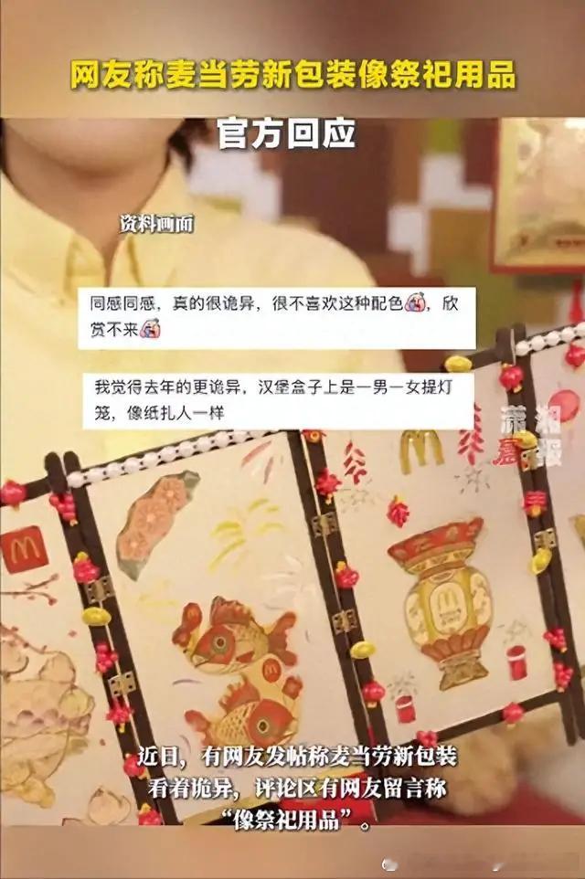 麦当劳新包装被吐槽诡异 麦当劳2026年春节档推出的非遗文化合作系列包装,因大量使用特定的传统色彩和线条,被不少网友吐槽视觉观感“诡异”,甚至有人认为其色调和设计神似“祭祀用品”。