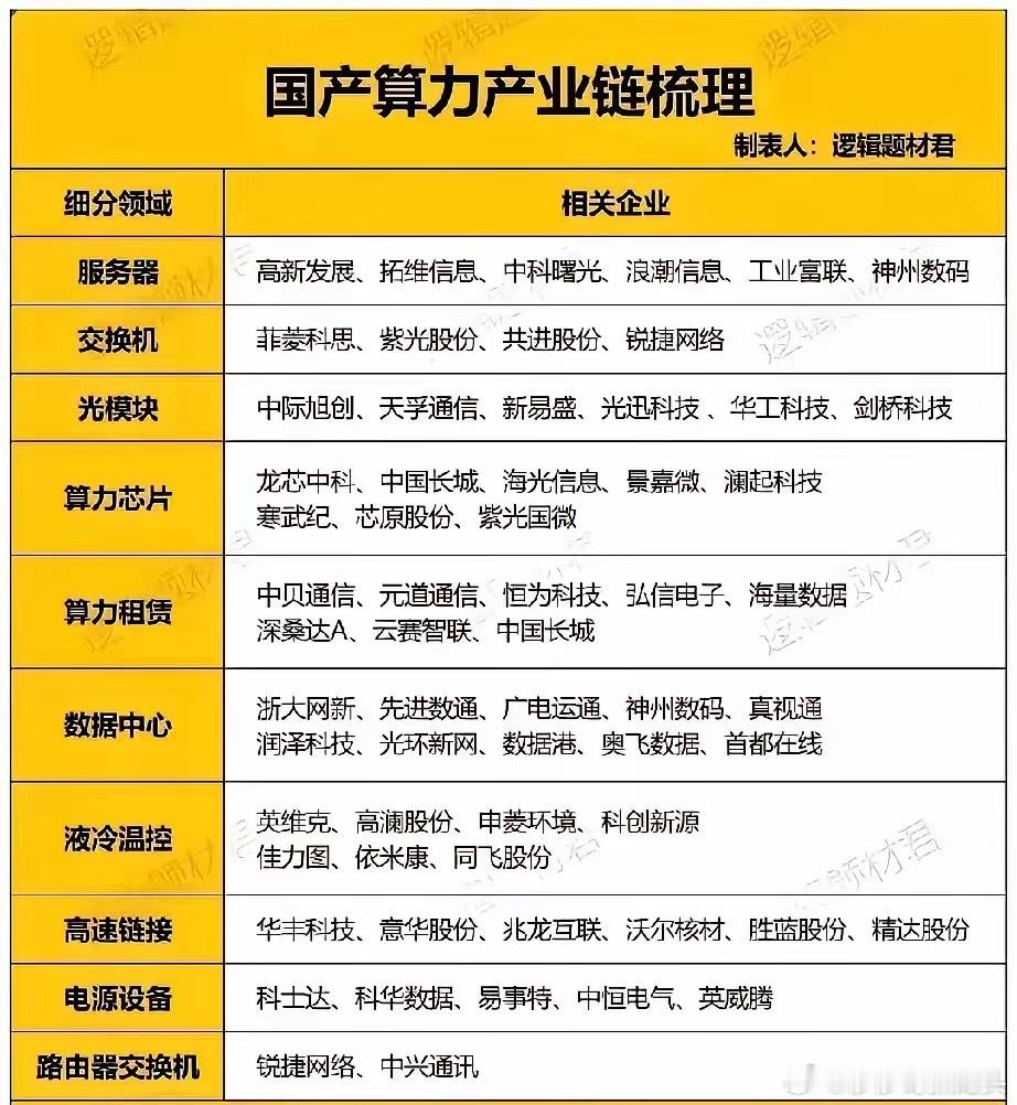 国产算力全产业链核心地图一、算力基石:服务器与芯片1. 服务器整机:高新发展、拓维信息、中科曙光(国家队标杆)、浪潮信息、工业富联。他们是承接国产芯片,将算力转化为服务的“直接载体”。2. 算力芯片:海光信息(CPU/DCU)、寒武纪(AI芯片)、景嘉微(GPU)、龙芯中科(CPU)、澜起科技(内存接口)。突围核心,在制裁下艰难但坚定地迭代。二、网络血脉:连接与传输1. 光模块(CPO):中际旭创、天孚通信、新易盛、光迅科技。算力集群的“高速公路”,需求随着AI算力爆炸式增长。2. 交换机/路由器:紫光股份、锐捷网络、中兴通讯、菲菱科思。数据中心内部的“交通枢纽”,决定算力输送效率。三、关键设施:承载与运维1. 算力租赁:中贝通信、恒为科技、云赛智联、润泽科技(数据港)。将稀缺算力资源化、服务化,让中小企业也能用上AI。2. 数据中心:光环新网、数据港、奥飞数据。算力的“物理家园”,持续受益于东数西算国家战略。3. 液冷温控:英维克、申菱环境、高澜股份。AI算力的“刚性需求”,高密度算力下,液冷从可选变必选。四、核心配套:电力与连接1. 高速连接:华丰科技(高速背板连接器)、兆龙互连、意华股份。算力设备内部的“神经与血管”,技术壁垒极高。2. 电源设备:科士达、科华数据、中恒电气。确保算力心脏7x24小时稳定跳动的“能源基石”。为什么必须关注这条产业链?三大核心逻辑:1. 自主可控的绝对刚需:在复杂国际环境下,国产算力是国家战略科技力量的底座,没有退路。2. 需求爆发的超级周期:大模型训练与推理带来算力需求每3-4个月翻一番,市场空间急速膨胀。3. 技术突破的成长红利:从“可用”到“好用”,国产芯片与设备正在经历性能快速爬坡,带来价值重估。这不仅仅是一次国产替代,更是一次在AI时代抢占核心基础设施主导权的 “系统性革命”。产业链上的每一环,都承载着打破垄断、支撑未来数字中国的使命。