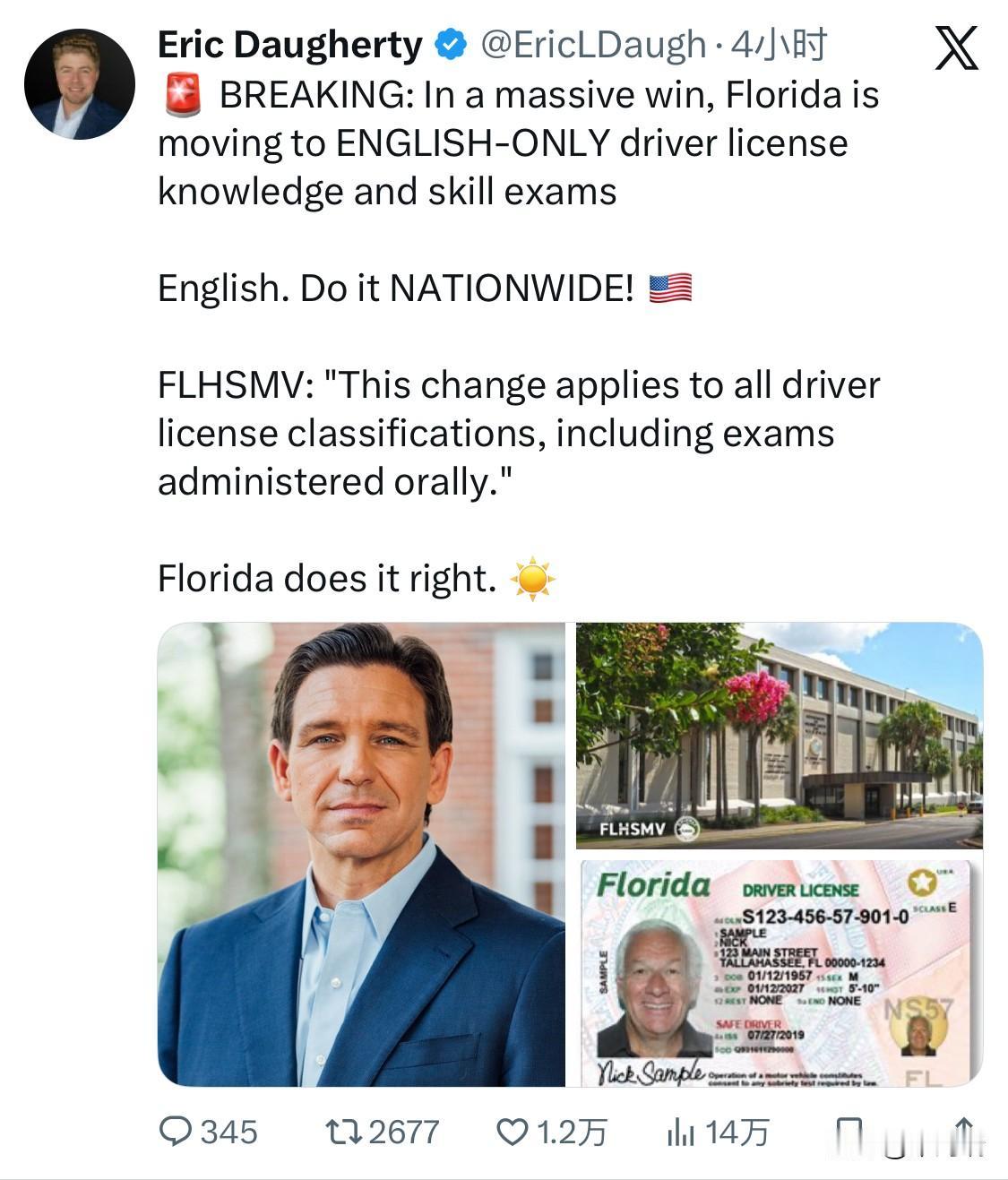 突发新闻:佛罗里达州公路安全与机动车辆管理局(FLHSMV)于 2026 年 1 月 30 日正式宣布,自 2026 年 2 月 6 日起,该州所有驾驶执照的知识(理论)考试和技能(路考)考试将仅以英语进行。 佛罗里达州公路安全和机动车辆管理局 (FLHSMV) 表示:“此项变更适用于所有驾驶执照类别,包括口试。” 以下是此次政策变更的核心要点: 全面英语化:此规定适用于所有类别的驾驶执照,包括普通(E 级)驾照、商业驾驶执照(CDL)以及商业学习许可证(CLP)。 取消翻译服务:考试过程中将不再允许使用人工口译员或任何语言翻译服务,同时也将移除所有非英语版本的纸质考试卷。 政策背景:在此之前,普通驾照的理论考试提供包括中文、西班牙语在内的多种语言选项,而商业驾照(CDL)通常提供英语和西班牙语。州政府表示,此举旨在确保驾驶员具备阅读道路交通标志并与执法人员有效沟通的能力。 全国趋势:此次调整也呼应了联邦层面近期对运输行业英语熟练度的严格要求。据报道,此前已有近 9,500 名商业卡车司机因英语能力不足被限制上路。