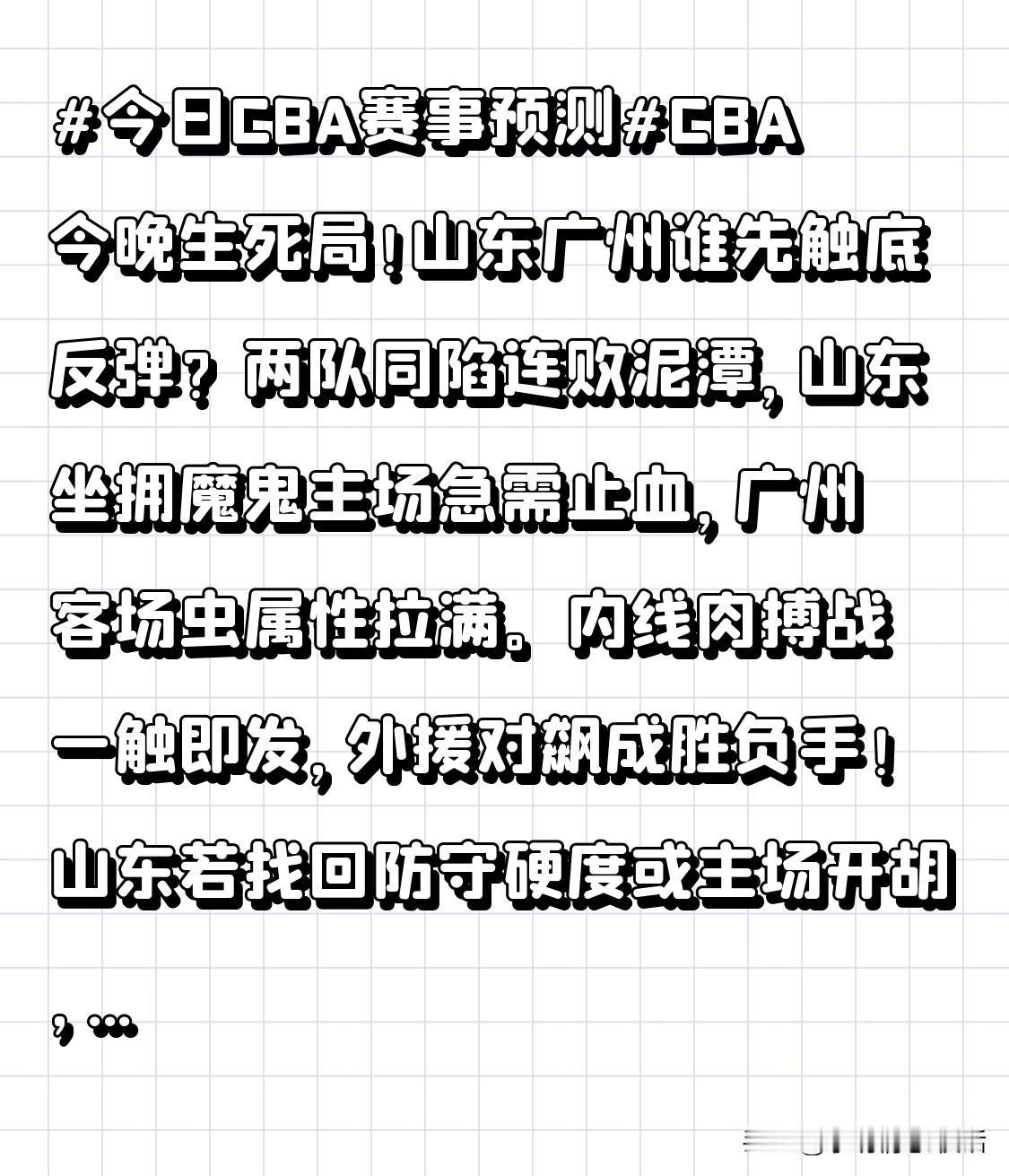 两队同陷连败泥潭,山东坐拥魔鬼主场急需止血,广州客场虫属性拉满。内线肉搏战一触即发,外援对飙成胜负手!山东若找回防守硬度或主场开胡,广州想爆冷需外援超神。 山东能否捍卫主场?广州能否逆天改命?速来评论区预言赛果!觉得分析到位,点赞收藏防走丢!