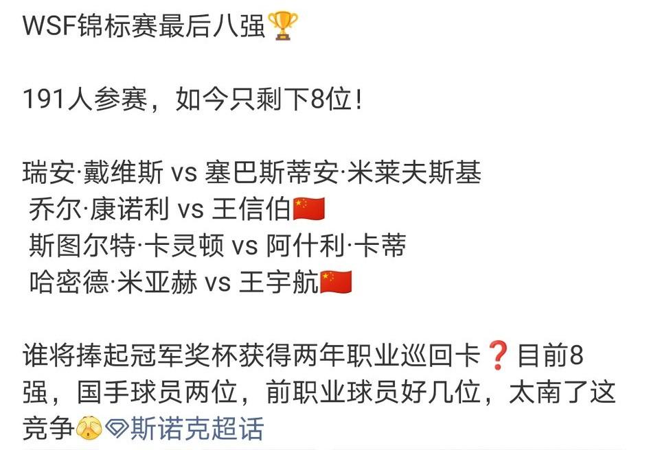 WSF锦标赛决出最后八强,191人参赛,如今只剩下8位!中国球员王信伯、王宇航在列。最终冠军获得两年职业资格。 说起来神奇,WSF锦标赛公开组竞争一向都很激烈残酷,年年都是三四十个前职业球员+其余全球最优秀的业余球员,差不多二百人争一个冠军。但近年却一直是中国球员笑到最后: 2025:高阳 2024:张家玮 2023:马海龙 2022:斯佳辉