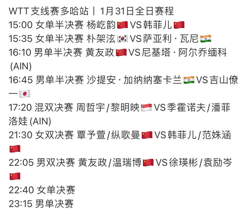 国乒包揽2冠,丢了1冠。 冲击2冠, 将要诞生5项冠军,1月31日决赛赛程出炉。 恭喜国乒,WTT支线赛男双和女双包揽冠亚军,对决的是队友,打好每一分,决胜负。 男单4强国乒占了1位,是黄友政,顺利晋级半决赛,才有决赛资格,冲击男单冠军。 女单,四强国乒占了2位,半决赛杨屹韵会师韩菲儿,已有1人锁定决赛,可以拿奖牌,期盼是金牌。 国乒有望夺取4冠收官。女单决赛22:40分,男单决赛比较晚,22:15分!