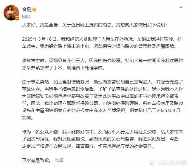 金晨就交通事故致歉:1月30日,演员金晨发布微博:深刻反省,今后一定更加严格遵守交通法规。