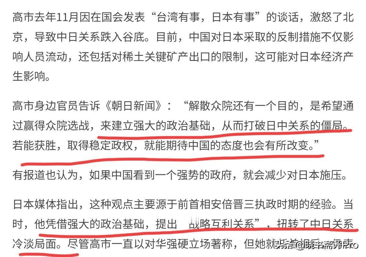 日本官员喊话称,高市早苗若胜选,中日关系会改善!1月31日,根据联合早报报道,高市早苗身边官员告诉《朝日新闻》称:解散众院还有一个目的,是希望通过赢得众院选战,来建立强大的政治基础,从而打破日中关系的僵局。此人表示,若能获胜,取得稳定政权,就能期待中国的态度也会有所改变。 日媒认为,日本方面认为,如果中国看到一个强势的政府,就会减少对日本施压。尽管高市一直以对华强硬立场著称,但她就任首相后,仍表示将秉承安倍提出的战略利益的互利关系理念,优先发展两国经济。对于日本官员的这一喊话,我们怎么看呢? 说实话,日本官员的这一态度充满了一厢情愿的自以为是。高市早苗能不能胜选跟中日关系的改善并无直接关系。高市早苗即便坐稳了位置,如果不认错,中日关系绝无改善的可能性。这位高市早苗的身边人有一种非常错误的认知,好像在中日博弈中,日本是优势的一方,现在是我们有求助日本,但事实完全相反。 中美在缓和关系,西方国家政要访华络绎不绝,而日本既要面对美国加的关税压力,也要面对我们对两用物项的管制。高市早苗的强硬不过是硬撑而已,但凡日本有实力,有底气,高市早苗面对我们的手段,也应该有所动作,但高市早苗却毫无作为。不是自己改正做法,却寄希望于我们就此罢手,日本有点异想天开。