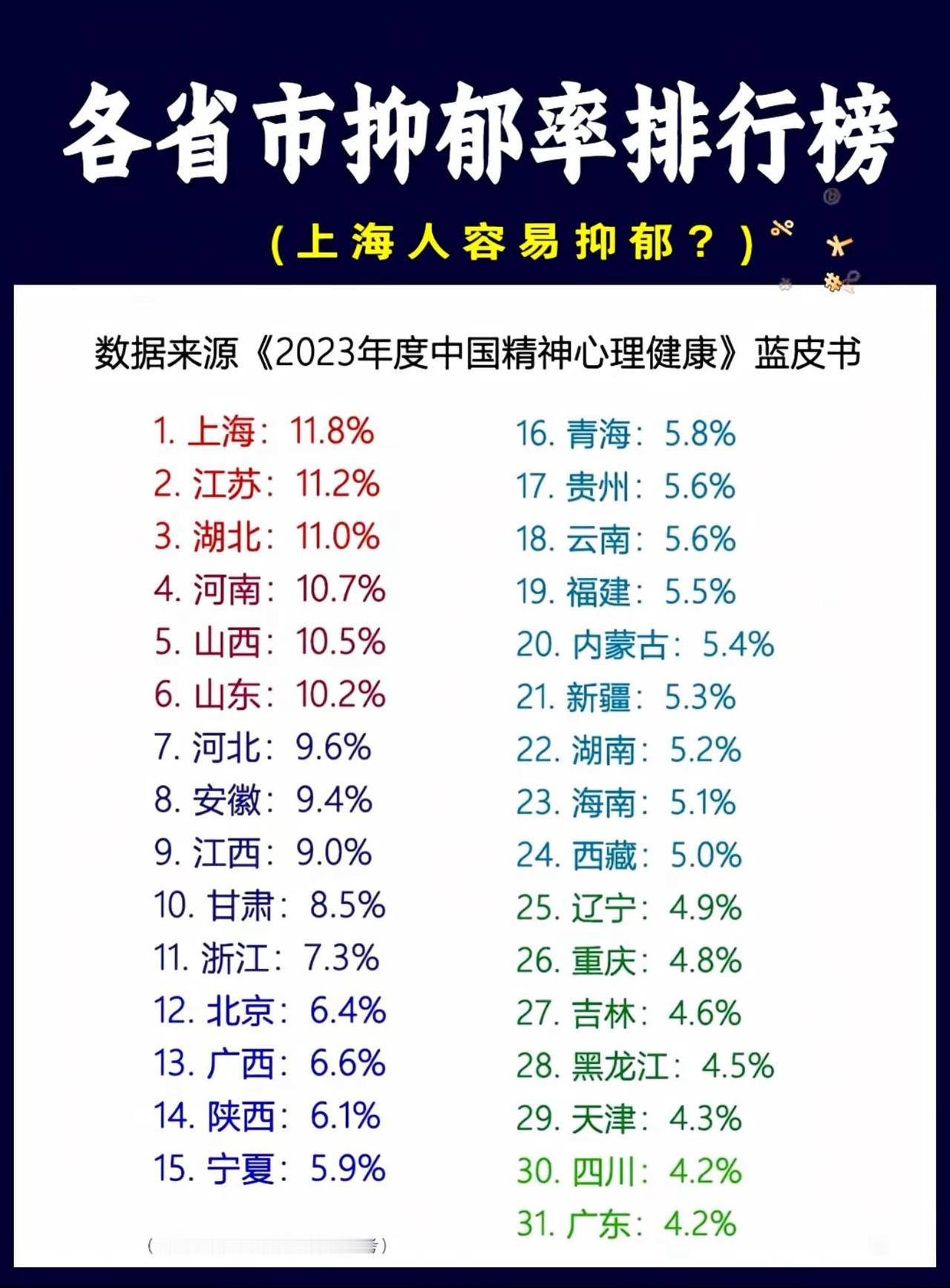 根据《2023年度中国精神心理健康》蓝皮书数据,全国各省市抑郁率差异显著。上海(11.8%)、江苏(11.2%)、湖北(11.0%)位居前三;而西南与东北地区如四川(4.2%)、广东(4.2%)、黑龙江(4.5%)则较低。分析认为,抑郁率与经济发达程度、生活节奏、社会压力及公众心理健康意识等因素可能相关。例如,上海等高压力、高竞争环境或推高抑郁风险;而部分低抑郁率省份可能得益于相对舒缓的生活节奏或较强的社会支持网络。整体呈现“东部高、西部低”的分布特征。