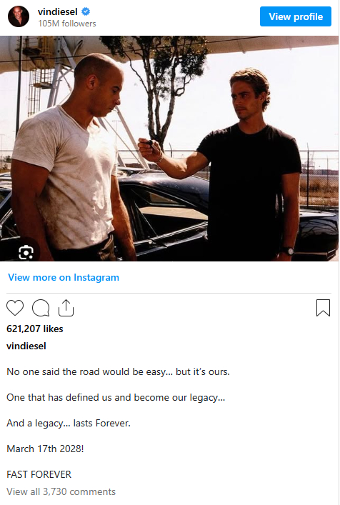 速激系列最终章定档!范·迪塞尔在社交平台上官宣,速度与激情系列的下一部电影正式定名为《Fast Forever》,并已定档 2028 年 3 月 17 日北美上映 。