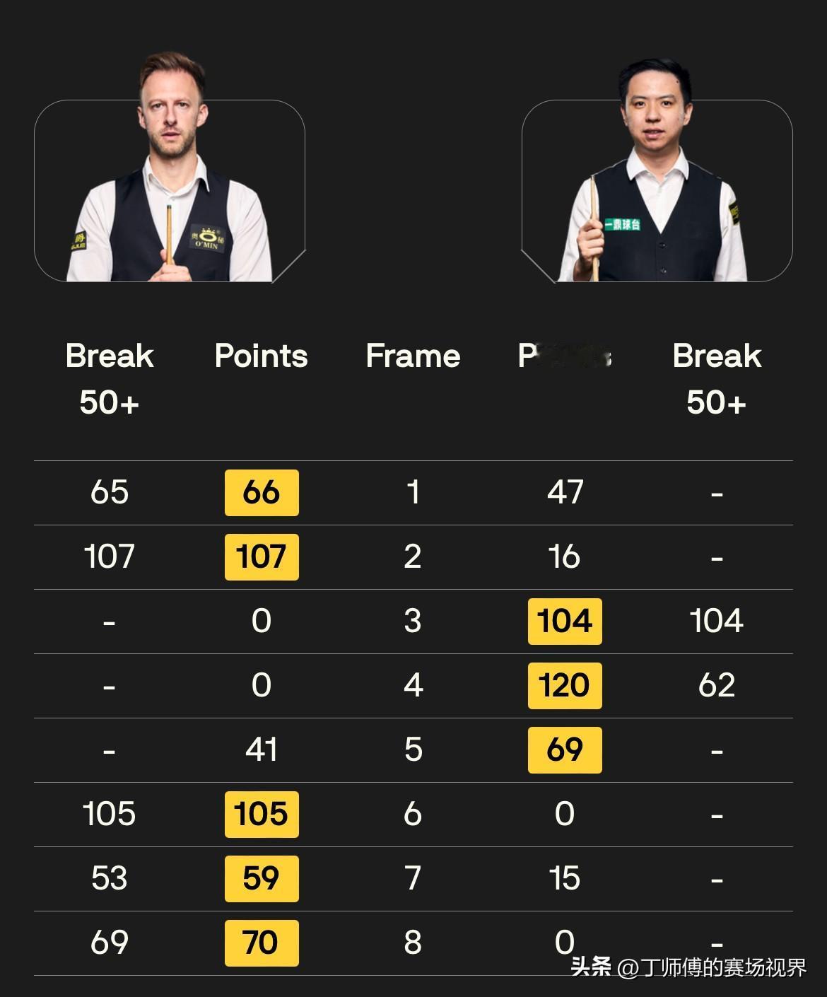 特鲁姆普击败肖国栋赛后采访:“今晚的比赛很艰难,我对自己的表现还比较满意,我们俩都打得很好。我现在有点累了,因为在场上需要时刻保持高度专注。””我认为阿里近些年在某些赛事中表现得不够专注,我的情况可能正好相反。当他来到这里参加世锦赛时,他似乎就变了另外一个人,这需要一些特别的东西。当你参加自己喜欢的比赛时,你不需要太用力,他对这样的大场面情有独钟。”“我每年都说这是我们参加的两三个顶级赛事之一,不是每个赛事都能让我们在这么多观众面前比赛,这很特别。今晚只是个预热,我们是最后一桌,但观众比这周早些时候还要多。明天肯定会更精彩。” 世界排名第一的特鲁姆普在德国大师赛1/4决赛以5-3击败签表中仅剩的一名中国球手肖国栋,将在半决赛对阵卡特。