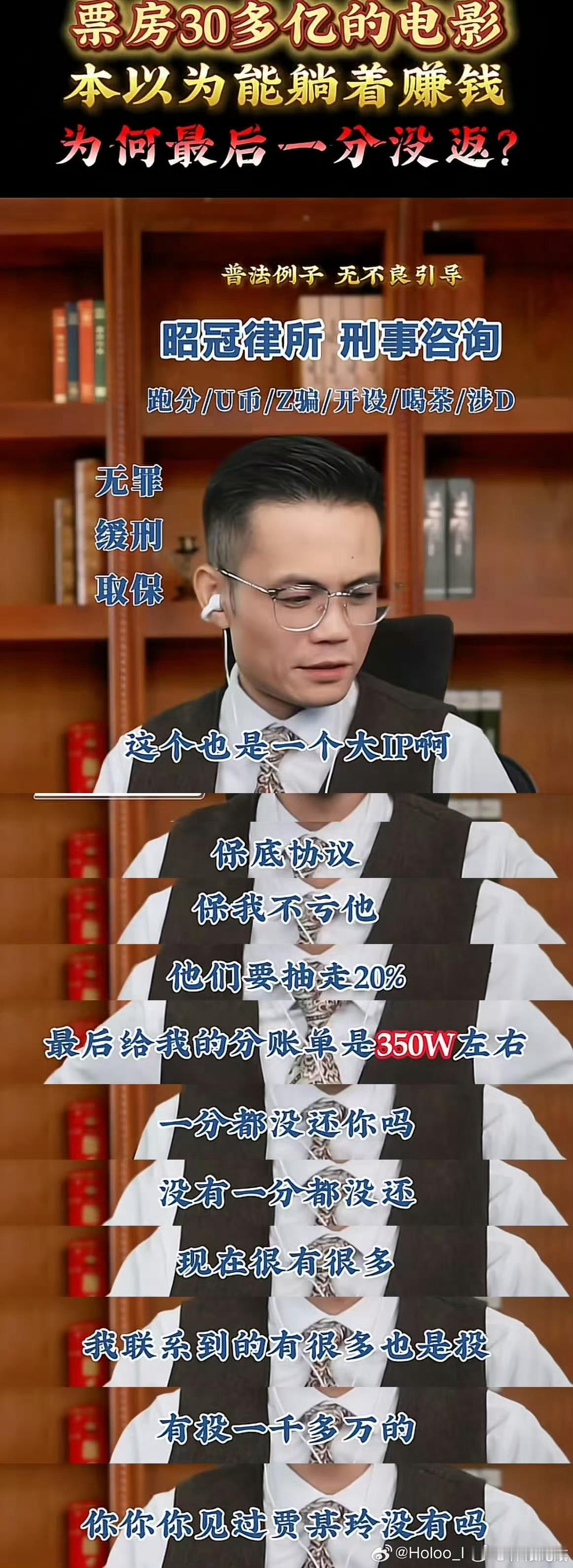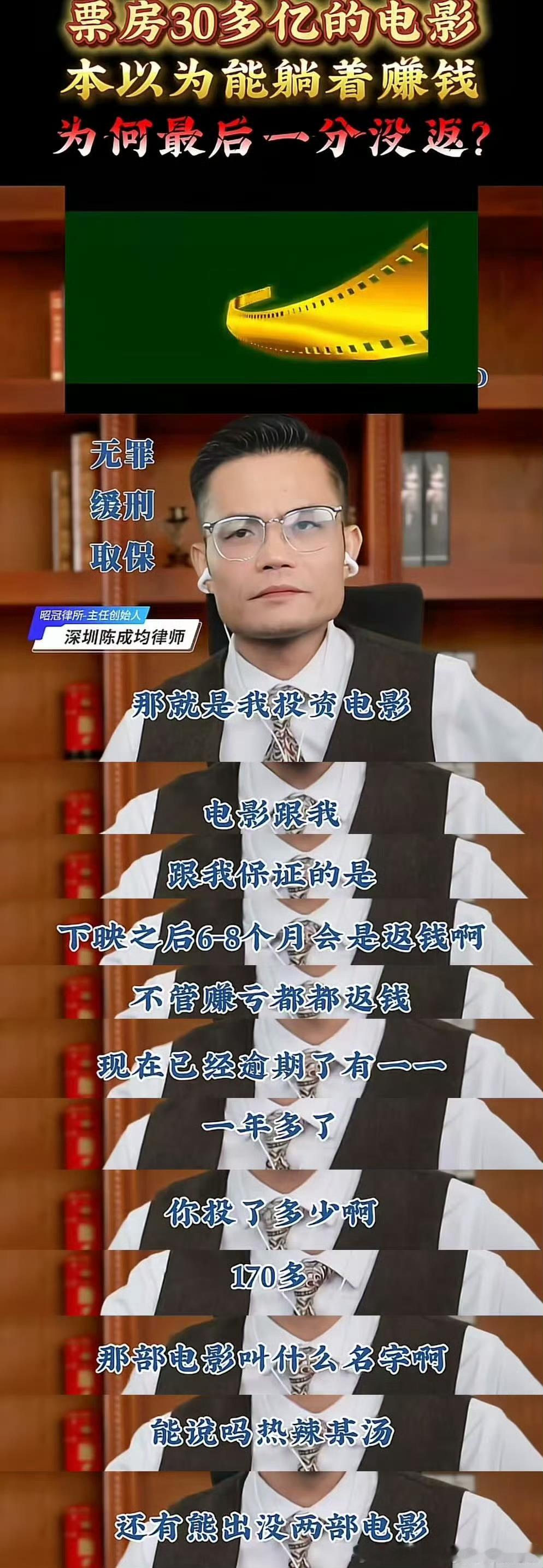 痘印有个律师连线,连线到一个网友说自己是春节档电影《热辣滚烫》和《熊出没》的投资人之一。投资了170多万,约定的是电影下映后6-8个月分账,然而电影上映结束快两年了也没见到分账,每次去催都没有后续。
