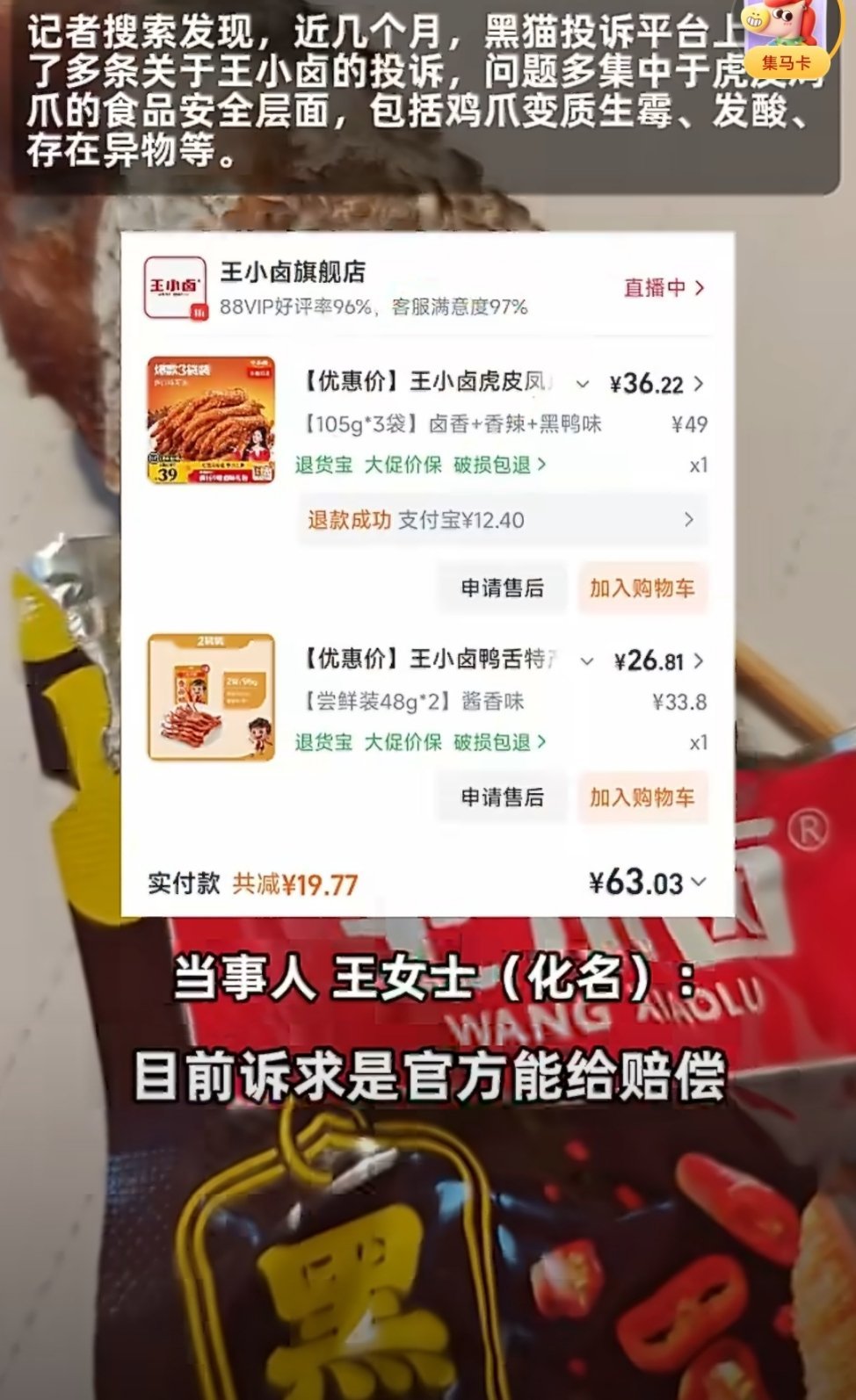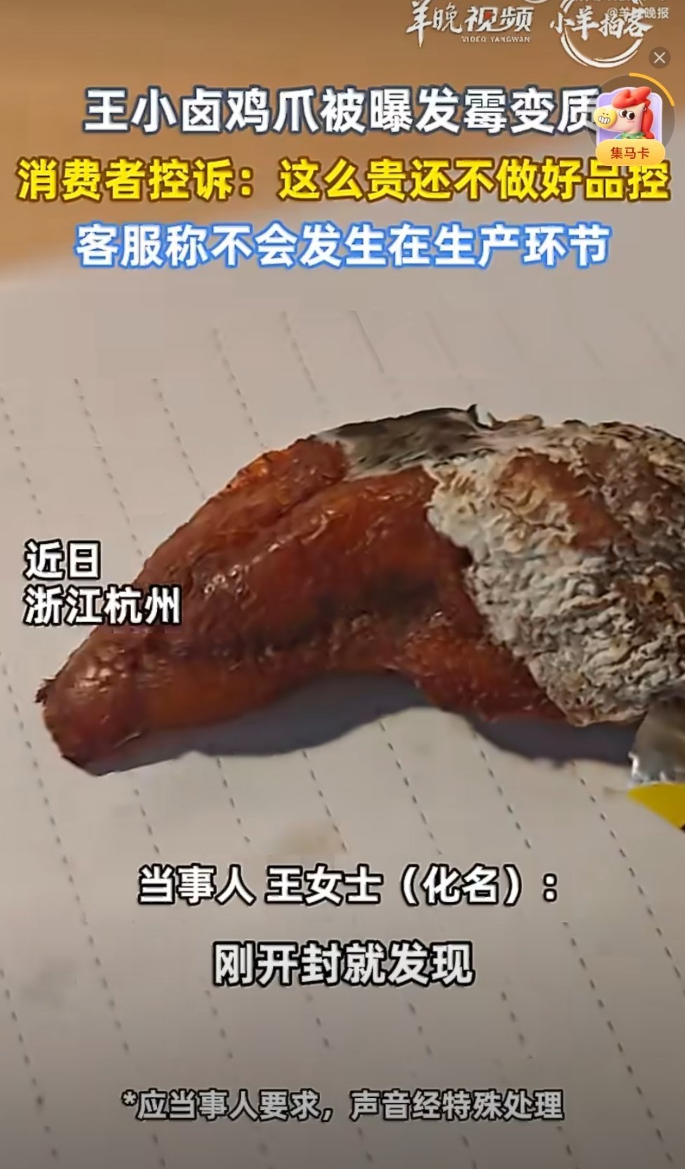 #王小卤鸡爪被曝发霉变质##王小卤客服回应鸡爪发霉变质#又是一起食品安全消息,消费者买的王小卤虎皮凤爪发黑变质,表面有白色霉菌。目前企业方表示会按单包十倍的价格进行赔偿。其实每个企业都可能会出现产品质量问题,有主动主观的,就是那种故意造假、偷工减料的。还有被动的客观的,比如运输过程中摔了、磨了。