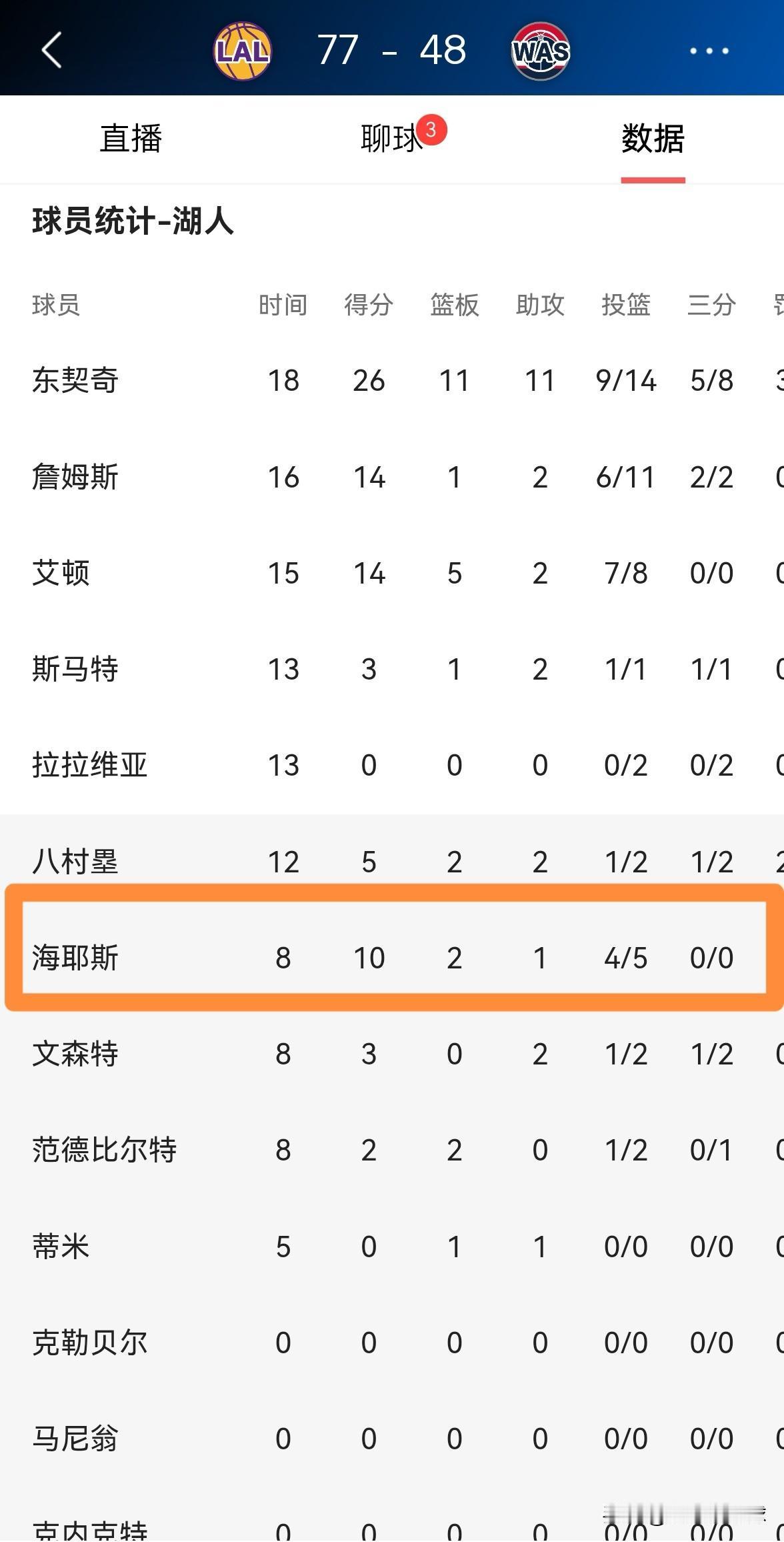 湖人中锋海斯不愧是新一代的饼皇!在今天湖人客场挑战奇才的比赛中,目前双方半场战罢,湖人以77:48领先奇才。在前两节比赛中,海斯在篮下得吃得喝被喂的饱饱的,他在替补出战的8分钟里,投篮5中4,其中罚球2中2极其高效的砍下10分,还有2篮板1助攻1抢断,没有出现任何的失误和犯规,他的场上正负值为+10。 海斯不愧是NBA新一代的饼皇,照这样发展下去的话,海斯迟早会被东契奇和詹姆斯喂成千万年薪级别的球员。