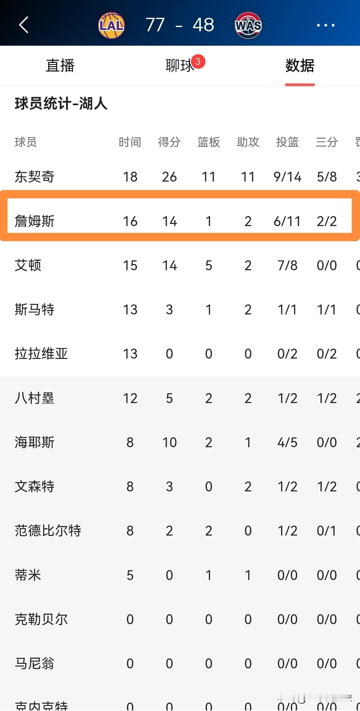 湖人巨星詹姆斯真是太懒了!在今天湖人客场挑战奇才的比赛中,目前双方半场战罢,湖人以77:48领先对手29分。让人感到非常意外的是,詹姆斯在前两节比赛中仅仅抢到1个篮板,而且还是1个后场篮板,这充分说明詹姆斯在拼抢篮板方面毫无积极性。 在前两节比赛中,詹姆斯首发出战16分钟,投篮11中6,其中三分球2中2得到14分,仅有1个篮板,他的场上正负值为+15。 希望詹姆斯能够在下半场比赛中多抢几个篮板,不然的话詹姆斯的数据就不够华丽了。