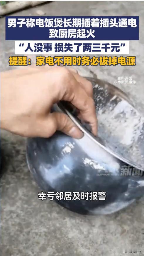 “悲剧还是发生了!”近日,四川眉山。一名男子用电饭煲做饭后,忘记了拔插头,于是长期插着插头通电,没想到下班回家后竟发现家中一片狼藉,本以为失窃却不想是厨房起火了,好在邻居及时报警才没造成人员伤亡。网友:家电不拔插头太危险了! 电饭煲是家家户户厨房必备的电器,煮饭方便又快捷,很多人用完后习惯只按关闭键,却懒得拔掉插头,觉得“一直插着也没事”,可殊不知这种做法非常危险。 据媒体1月29日报道,吕先生平时用完电饭煲后,习惯性不拔插头,一直让其处于通电待机状态。这天凌晨,他下晚班到家门口时,发现屋里一片狼藉,还以为是进贼了。 而后才得知是家中厨房突然起火,好在邻居及时发现报了火警,虽及时控制住火势,人也安然无恙,但厨房内的橱柜、厨具等物品被烧毁,初步核算损失达两三千元。 吕先生后怕又庆幸,怎么也没想到长期不拔电饭煲插头,会酿成火灾。毕竟自己一直觉得电饭煲待机耗电少、不会出事,这次电器长期通电出现的短路导致的火灾,也是让自己吃了大亏。 由此可见,家用电器长期通电待机,不仅会浪费电量,还可能因线路老化、元件故障引发短路、火灾等事故。尤其是电饭煲、电热水器等大功率电器,用完后务必及时拔掉插头,定期检查电器线路,发现老化、破损及时更换,杜绝安全隐患。 信息来源:《1月29日(报道)四川眉山,男子称电饭煲长期插着插头通电致厨房起火:人没事损失了两三千元,提醒:家电不用时务必拔掉电源