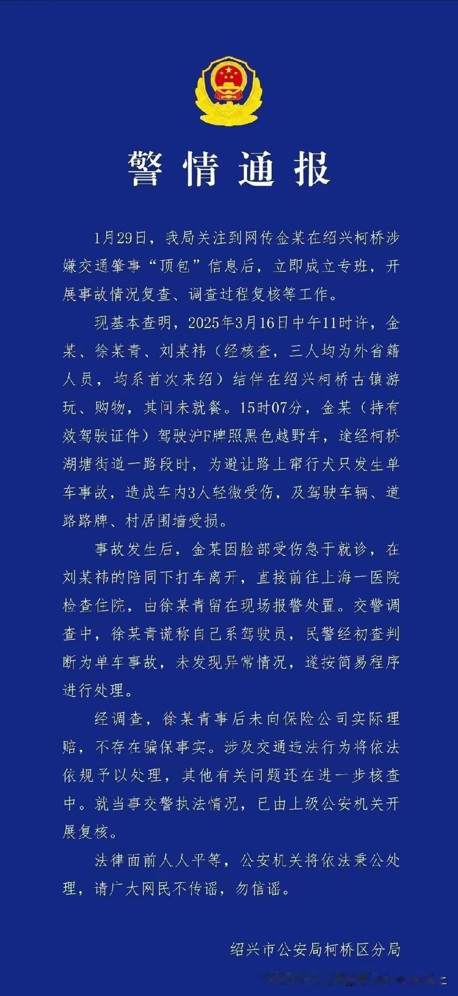 我看了这个通报,其他能圆过去,但是有个地方说不通: 为什么明明不是助理开的车,助理要谎称是自己开的车呢?这样做的目的是啥?为啥要撒这样一个谎? 如果没有任何目的,正常人是不会在警察面前说谎吧?没必要啊