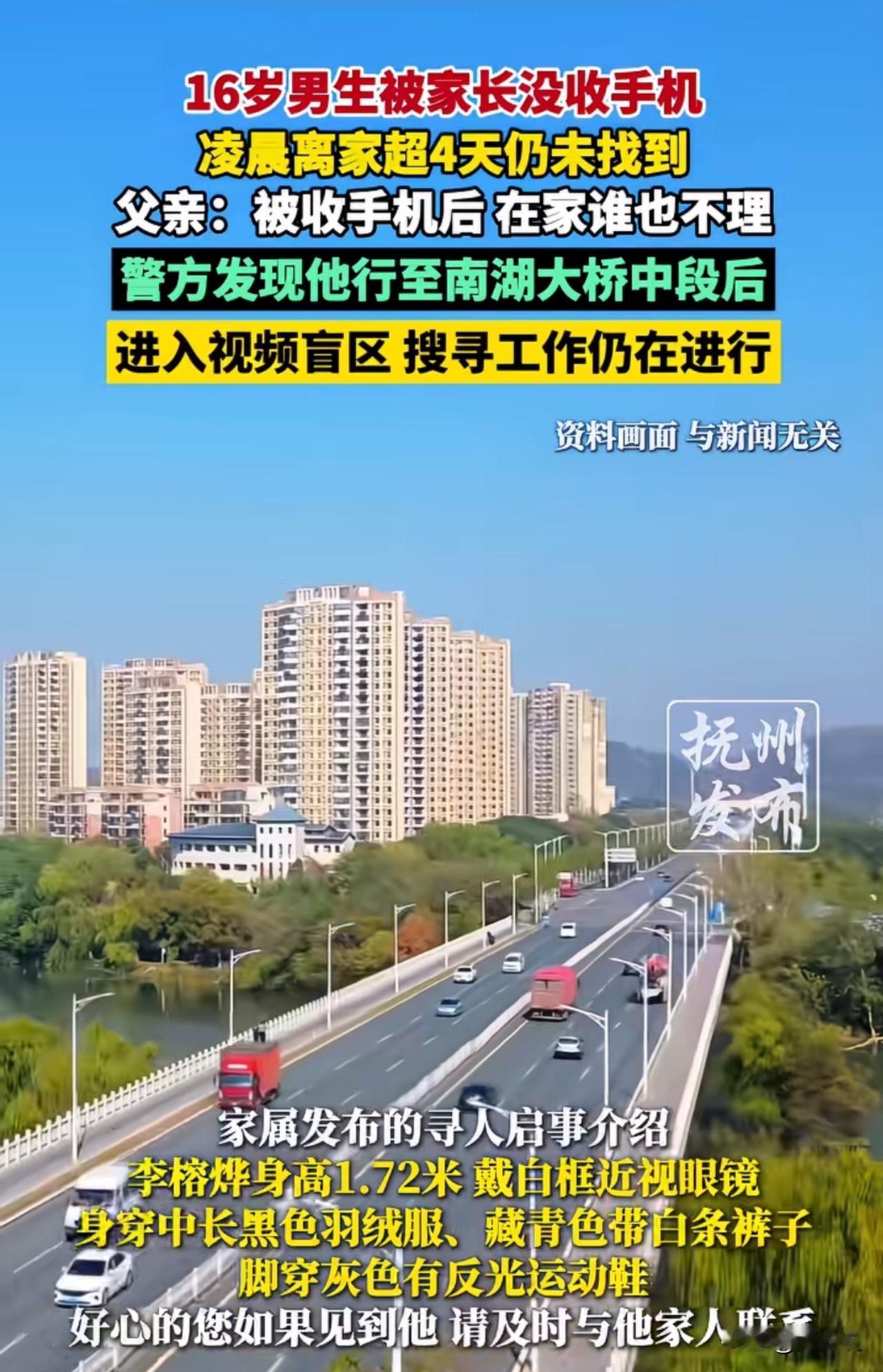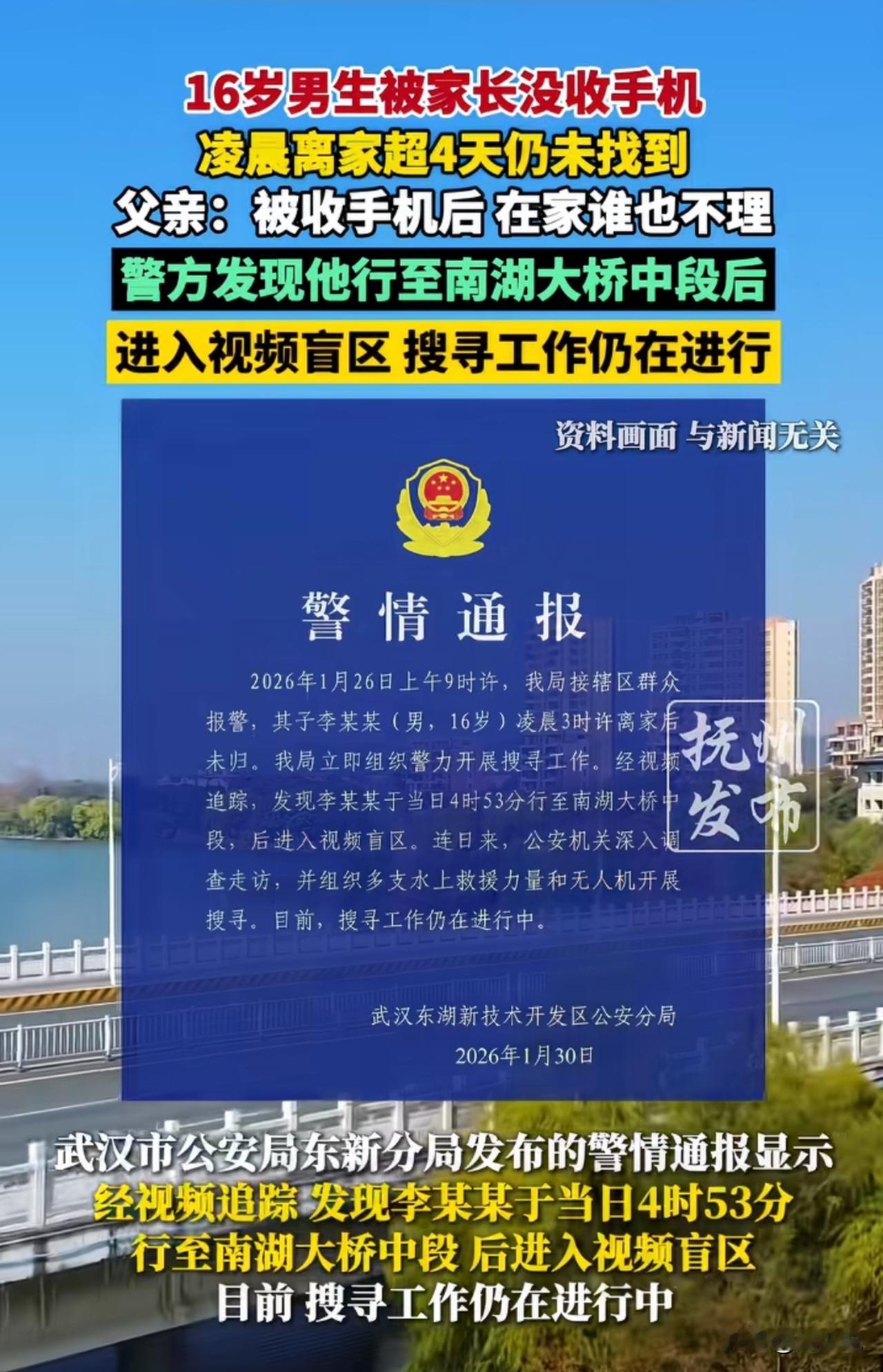 “揪心!”武汉一名16岁男生,只因手机被家长没收,竟在凌晨悄然离家,截至目前失联已超4天。父亲坦言,孩子被收手机后便闭门不出,谁也不理,没想到会做出这样的举动。警方调取监控发现,男生行至南湖大桥中段后进入视频盲区,搜寻工作仍在紧张进行。 此事引发全网揪心热议。有网友感叹:“青春期的孩子敏感又好强,简单没收手机真的很容易激化矛盾”! 也有网友反思:“家长的初衷是好的,但方式是不是太生硬了?” 在周少看来,手机并非洪水猛兽,青春期也不是叛逆的代名词,问题的核心往往藏在亲子沟通的缝隙里。 家长担心孩子熬夜玩手机影响健康,这份顾虑合情合理,但简单粗暴的没收,很可能让孩子觉得不被尊重。 实际上,教育从来不是“我说你听”的控制,而是心与心的双向奔赴。与其强硬管控,不如坐下来和孩子聊聊手机里的吸引力,一起制定双方都能接受的使用规则。 青春期的孩子,需要的不是被“管教”,而是被“看见”,看见他们的情绪,理解他们的需求。希望这个男孩能早日平安回家,也愿所有家长都能明白,温柔的引导,远比强硬的禁止更有力量。#寻美三湘# #长沙新朋友#