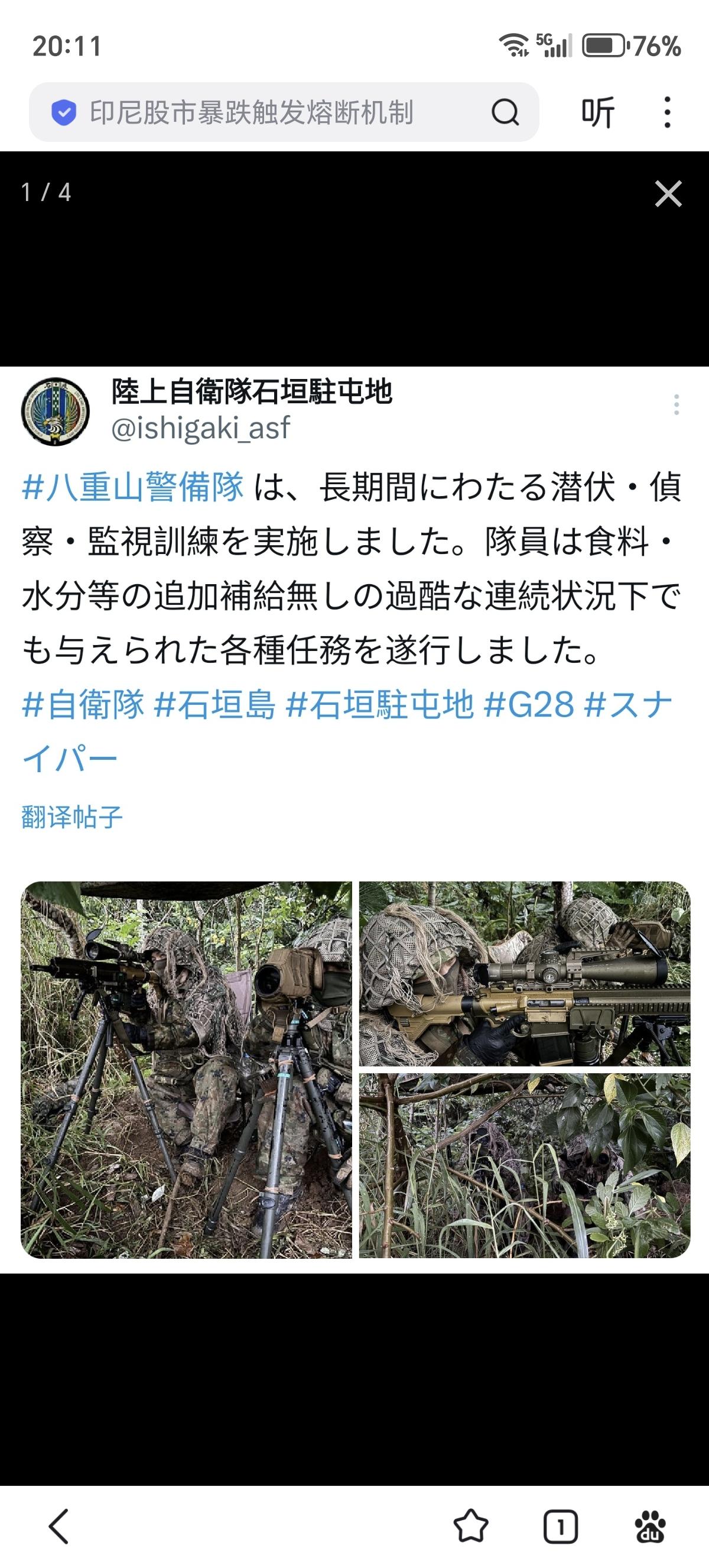 八重山警备队属于日本陆上自卫队的普通科(步兵)部队,担负岛屿警备和防卫作战等任务。它是根据日本加强 南西方面防卫战略的一环成立的,旨在执行针对中国台湾、钓鱼岛方向的作战行动。驻扎在琉球石垣岛的日本陆上自卫队“八重山警备队”列装的德国G28精确射手步枪(HK从 MR308(民用版 HK417)基础上军用化、专用化改进的指定射手步枪),该枪配备Leupold Mark 5HD 5-25x56型光学瞄准镜