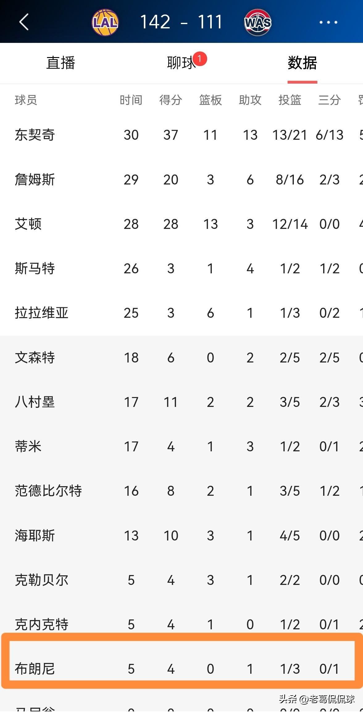 湖人新星布朗尼真是太神奇了,他是上场必能暴扣!在今天湖人客场以142:111大胜奇才的比赛中,虽然布朗尼没能命中三分球,但是他再次奉献了一记技惊四座的单臂滑翔暴扣。 全场比赛下来,布朗尼替补出战5分钟,投篮3中1,其中罚球3中2得到4分1助攻,他的场上正负值为+4。 值得一提的是,在最近两场比赛中,布朗尼场均能够奉献一记暴扣,展现出了非常出色的身体素质。