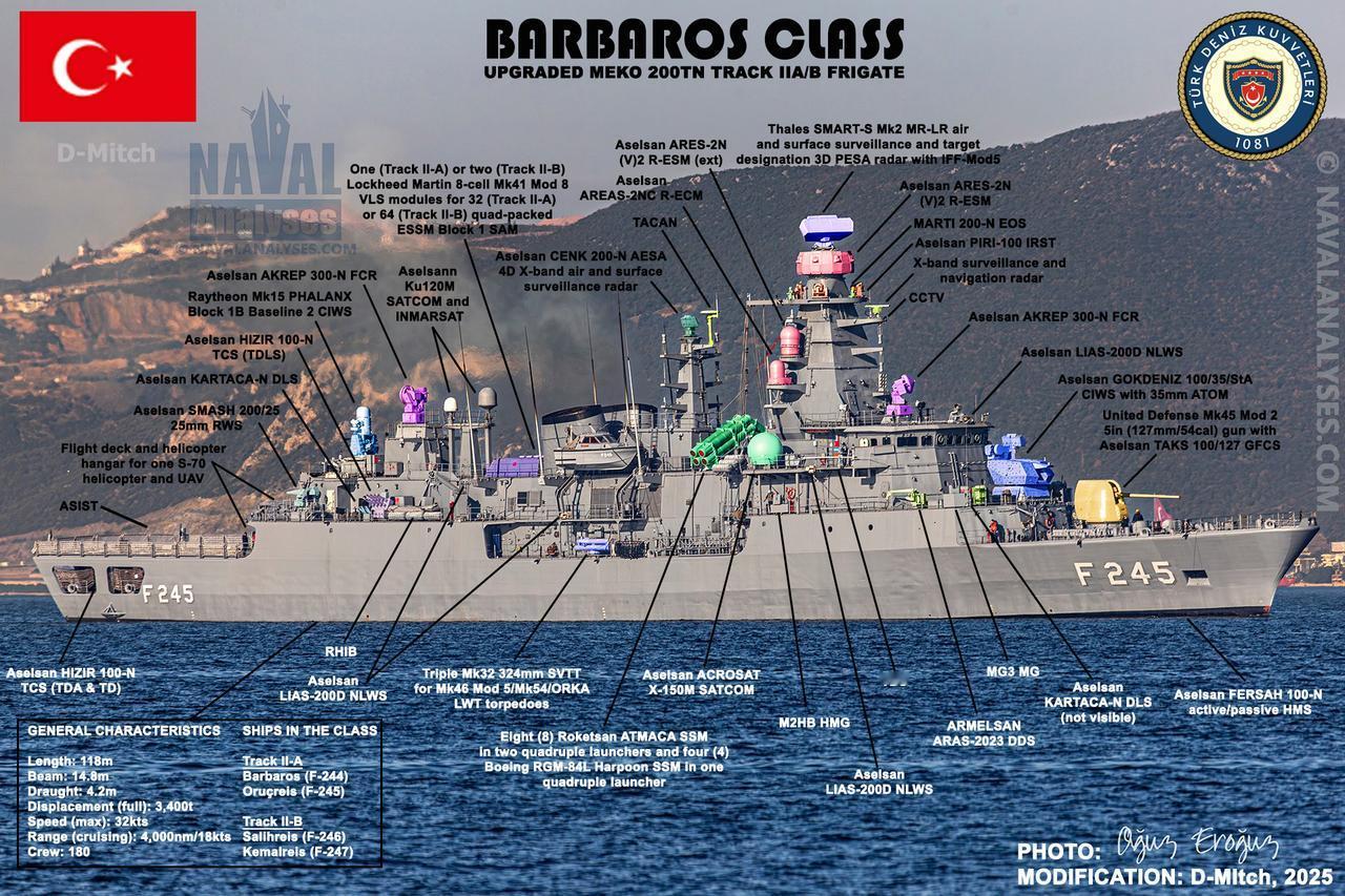 巴巴罗斯级护卫舰是土耳其海军的中型多用途护卫舰,为德国布洛姆 + 福斯公司设计的 MEKO 200 TN 型护卫舰的土耳其本土化版本,核心设计依托 MEKO 模块化造船理念,由土耳其本土船厂建造,是土耳其海军 90 年代至 21 世纪初的主力护卫舰之一,也是其海军现代化建设的核心装备。 土耳其海军于 2018 年启动该级舰的中期现代化升级,核心方向为装备国产化替代,大幅提升自主作战能力,升级后核心装备替换为: ⚓️反舰:鱼叉导弹替换为土耳其本土研发的阿特马卡(Atmaca)反舰导弹,射程提升至 280 公里,具备超视距反舰能力; ⚓️防空:MK-41 垂发系统适配土耳其本土希萨尔(Hisar)中近程舰空导弹,替换海麻雀导弹,防空射程和抗饱和攻击能力提升; ⚓️其他:近防系统优化、反潜声呐升级,同时整合土耳其本土的战术数据链,实现与土耳其海军其他舰艇的信息互通。 电子系统 原版核心传感器和火控系统均为西方进口,升级后逐步替换为土耳其国产设备,形成完整的战场感知与指挥控制系统: ⚓️主雷达:泰雷兹 SMART-S Mk2 三坐标对空搜索雷达,对空探测距离 250 公里,可同时跟踪 400 个空中目标,为防空作战提供核心态势感知; ⚓️火控雷达:2 座 AKREP300-N 火控雷达,引导舰空导弹和舰炮进行精准拦截; ⚓️电子战:配备西方制式的电子侦察、干扰系统,升级后替换为土耳其国产电子战套件; ⚓️指挥系统:基于 MEKO 模块化的战术指挥系统,升级后整合土耳其海军本土的 GENESIS 战术数据链,实现多舰协同和联合作战。