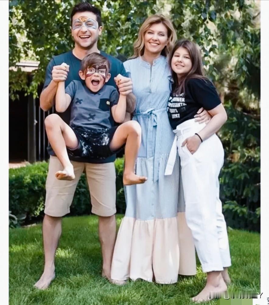 这是泽连斯基与他的妻子及儿女在户外草坪上的一张全家福,拍摄于俄乌战争前。一家四口其乐融融,幸福写满全脸。