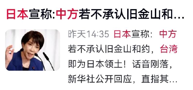 日本高官叫嚣“中方不认旧约,台湾就归日本”,简直是痴人说梦!中国外交部已严正驳斥,指出所谓“旧金山和约”完全非法无效。 当年美国单方面主导的“旧金山和约”,把中国排除在外,连苏联等战胜国都拒绝签署,根本不具法律效力,更无权处置中国领土。而具有国际法效力的《开罗宣言》《波茨坦公告》及日本投降书,早已明确规定台湾归还中国。1945年中国政府正式收复台湾,这是铁的事实。 日本右翼蓄意搬出非法和约炒作,不过是为配合美国亚太战略、煽动“台湾地位未定论”。近年来日本不断突破和平宪法、增加军费,此次言论正是为其军事扩张制造借口。 台湾问题纯属中国内政,一个中国原则是国际社会普遍共识。日本曾对台湾殖民侵略,罪行累累,没有任何资格对台湾问题说三道四。我们正告日方:台湾是中国的一部分,一切干涉中国内政的企图都不会得逞。若真想维护地区和平,就应立即停止挑衅言行! 各位读者怎么看?