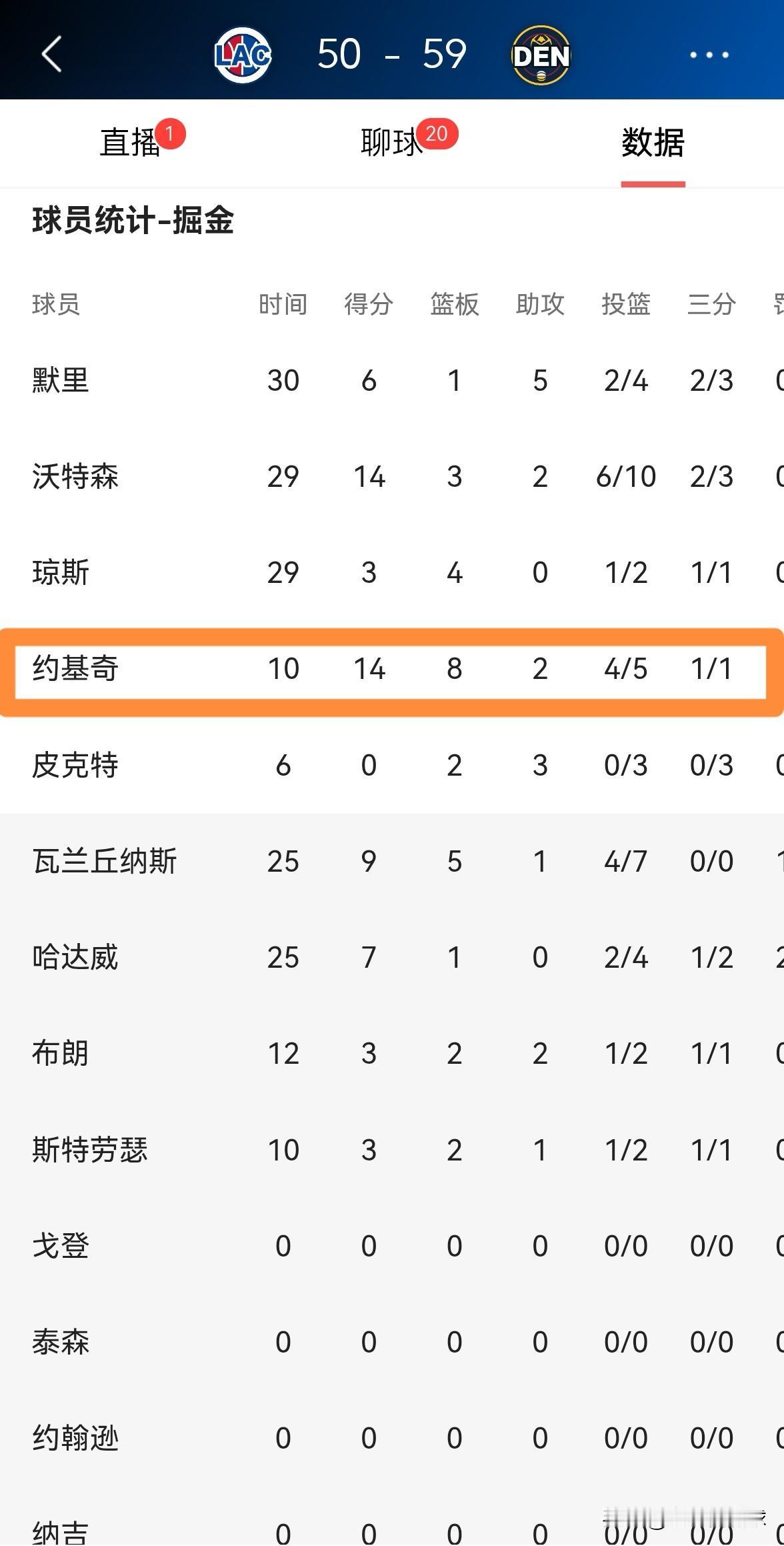 掘金超级巨星约基奇真是太让人惊喜了!在今天掘金主场迎战快船的强强对话中,目前双方半场战罢,掘金以59:50领先对手。在前两节比赛中,约基奇首发出战10分钟,投篮5中4,其中三分球1中1、罚球8中5轻松砍下14分,外加8篮板2助攻1抢断,他的场上正负值为+2。 约基奇真是太让人惊喜了,虽然他因伤缺阵了很长一段时间,但是他在回归赛场之后立刻打出了极其出色的表现。