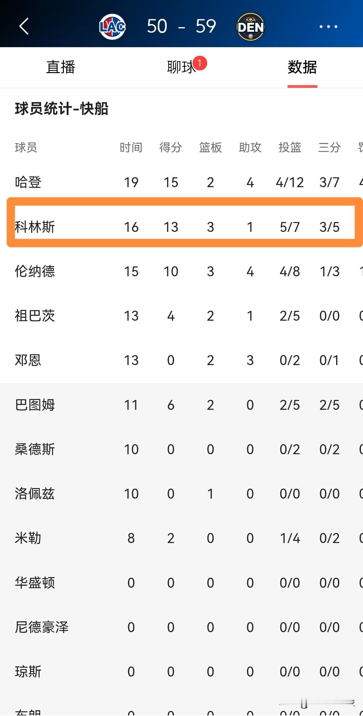 快船大将科林斯真是太高效了!今天快船在客场挑战掘金,目前双方的上半场比赛已经结束,快船以50:59落后对手9分。在前两节比赛中,科林斯打出了非常高效的表现,他在首发出战的16分钟里,投篮7中5,其中三分球5中3非常高效的砍下13分,还有3篮板1助攻1抢断,没有出现任何的失误。