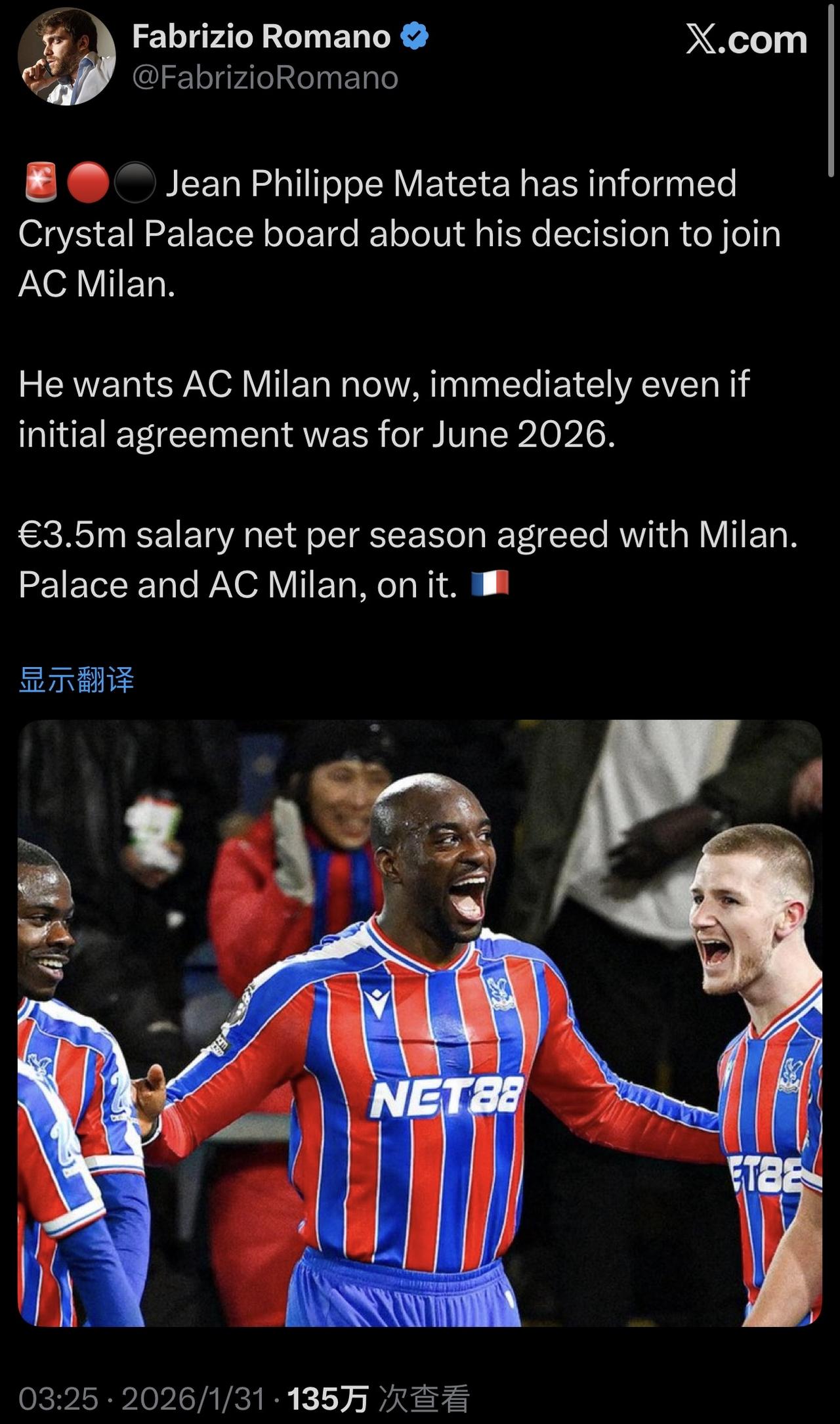 马特塔和水晶宫彻底闹翻! 难怪水晶宫5000万买了狼队的替补前锋。即使个人所得税再低,350万欧税后的工资也不高。 但意甲的赛程,场次和每场强度节奏,等于出在英超一半的力气,就赚到这份工资了[呲牙] ……………………………………………………………… 马特塔已将他加盟AC米兰的决定告知水晶宫董事会。 他现在就想加盟AC米兰,而不是2026年6月加盟。 他与米兰方面商定,AC米兰同意其年薪净额为350万欧元。