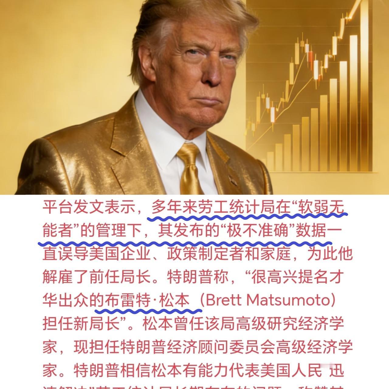 特朗普一天内连换两员大将! 美国劳工局局长也被炒鱿鱼了, 特朗普怒批他“软弱无能”,称其发布的数据“误导市场”。 布雷特松本接任。 他可不简单。他是保守派智库的资深经济学家,长期批评“过度监管”,主张自由市场。 更关键的是,他和特朗普经济团队理念高度契合,认为此前通胀数据“被夸大”,就业统计“需要调整”。让他执掌劳工统计局,等于直接握住美国经济数据的“话筒”。 这下有意思了! CPI、非农、失业率,所有牵动市场神经的核心数据,都从这儿出。加上刚刚确定美联储主席候选人凯文·沃什,这也是川普的人,那也是川普的人,那经济数据与货币政策两大关键领域,是不是就可以随意切换了? 难怪有人调侃:以后想看什么数据,就能出什么数据?