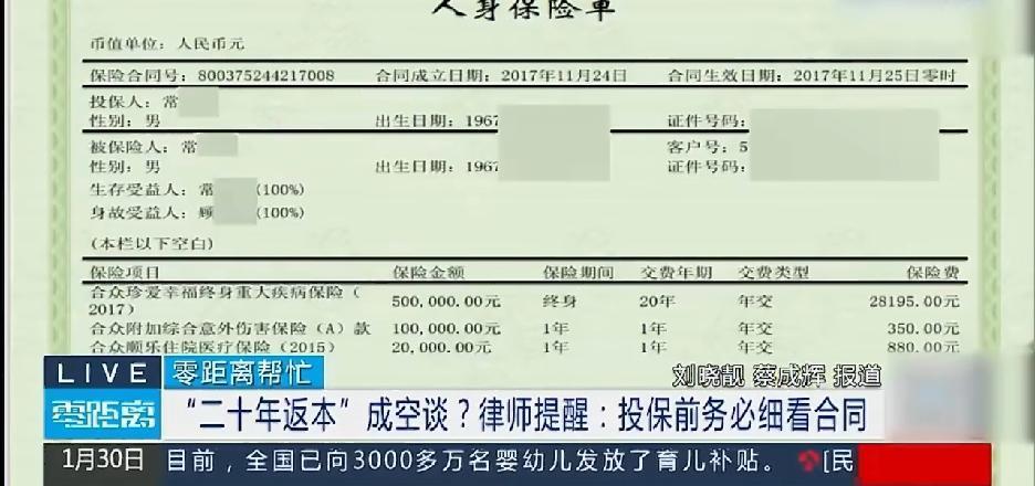 我什么都敢买,就是不敢买保险。 刚看到一个报道,说是朋友给他推荐一款投保八年,20年后返还本金的保险。结果是每年交53000,最后却发现是类似于一种医疗保险,压根没有什么返本,当初的朋友业务员也早就离职跑路了。 这让我想起我爸当年也被推荐买了一款类似的产品,每年也要交2万块钱,还是被叫去“听课”后才买的,还送了一份听课礼品,我一听说这个事,立马就让我爸给退了,我爸为这个事还说我没有眼光呢,现在看来,还好退的快,不然估计也得落个血本无归。那个礼品人家还特地来我家要回去了。这种返本类的保险,家里老人最容易上当了,本意都是想减轻子女的负担来着。 现在的保险条款比我命都长,谁有时间一条条去看啊,但是不看指不定哪里就有个坑等着你,尤其是有亲戚朋友干保险的,更是得敬而远之,往往坑的就是我们,我的宗旨就是所谓的投资类保险,能不买就不买,天上哪里会掉馅饼。