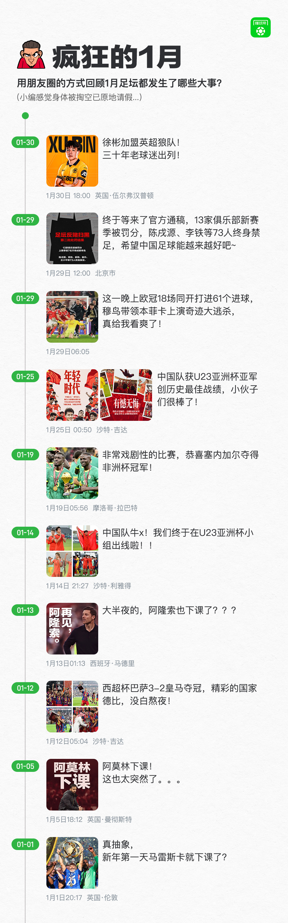 名帅接连下课、U23国足创历史、足坛反赌扫黑...用朋友圈的方式回顾1月足坛都发生了哪些大事?