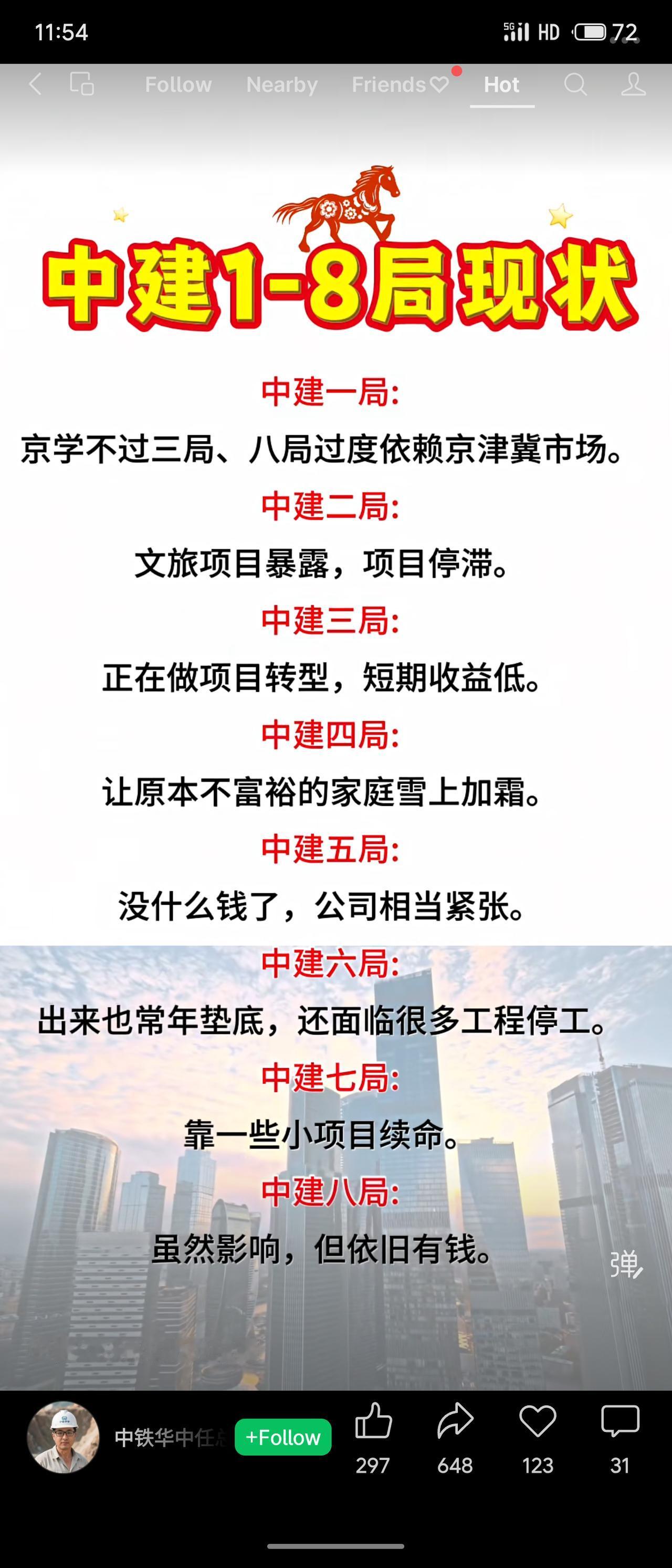 以概括性语言描述了中建集团下属1-8局的经营现状。总体来看,多数工程局面临不同程度的压力:一局、八局市场相对集中;三局处于转型期;二、四、六、七局则反映出项目停滞、资金紧张或依赖小项目维持的问题。这在一定程度上映射出当前建筑行业整体承压、部分企业面临区域市场依赖、业务转型阵痛及现金流挑战的现状。但作为央企骨干,其整体基本盘依然稳固,信息多为概括性描述,实际情况需结合具体财务与经营数据综合分析。
